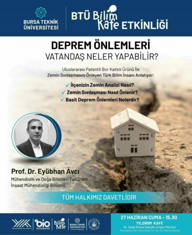 Bursa Teknik Üniversitesi, akademik bilgi birikimini toplumla buluşturuyor. Yükseköğretim Kurulu (YÖK) Bilim İletişim Ofisi koordinasyonunda hayata geçirilen “Bilim Kafe” etkinliği kapsamında, zemin sıvılaşmasını önleyen bor katkılı malzemenin mucidi Prof. Dr. Eyübhan Avcı, Yıldırım’da vatandaşlarla bir araya gelerek deprem gerçeğini ve alınabilecek önlemleri paylaşacak.