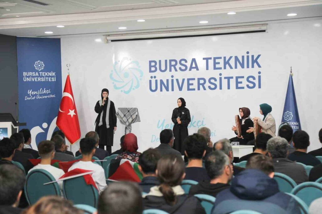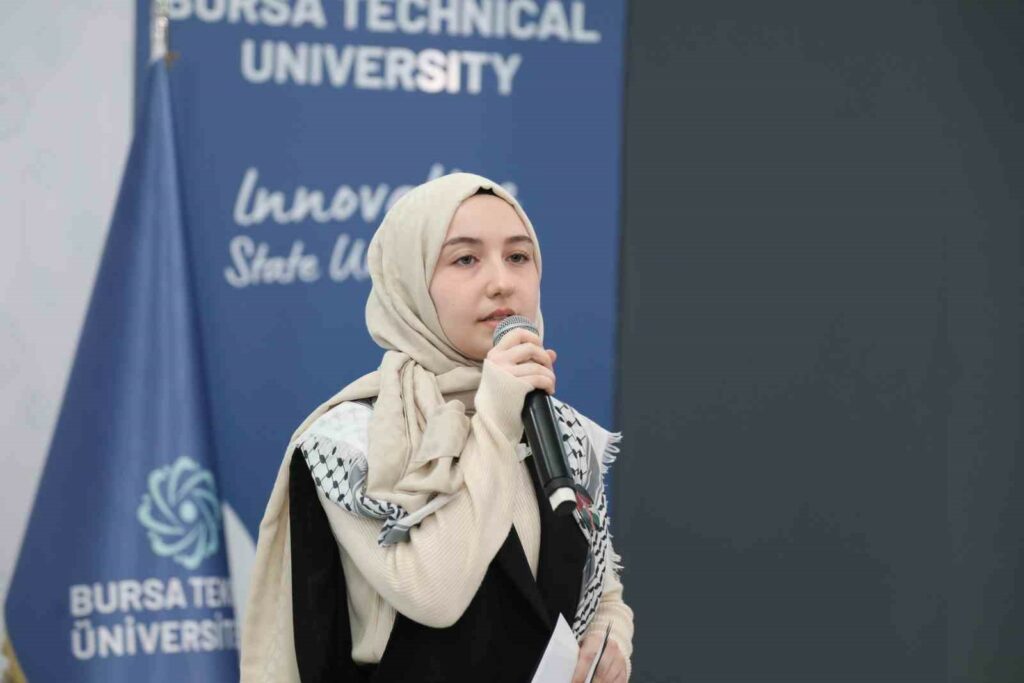 Rektör Çağlar’ın konuşmalarının ardından Bursa Teknik Üniversitesi ve Gülçiçek Hatun İmam Hatip Lisesi öğrencileri, Gazze için şiirlerini okudu. Mehmet Akif İnan’dan Mescid-i Aksa, Nuri Pakdil’den Anneler ve Kudüsler, Arif Ay’dan Kudüs Konuşuyor, Dursun Ali Erzincanlı’dan Ben Kudüs’üm gibi şiirler, öğrenciler tarafından Filistin direnişçilerine armağan edildi.