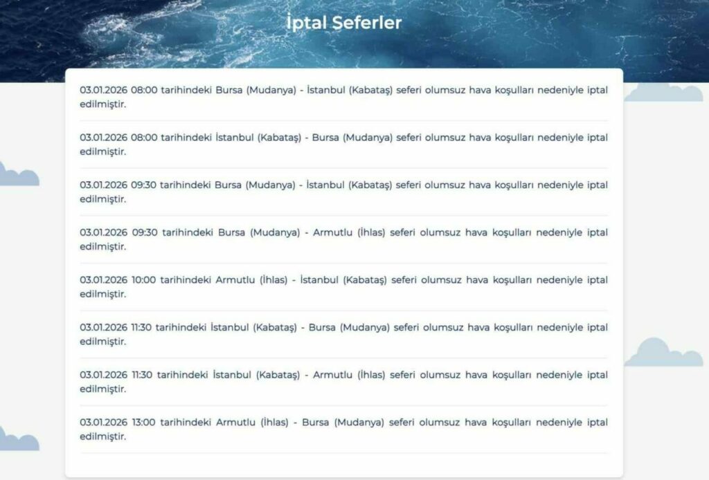 İptal edilen seferler şöyle: 08.00 Bursa (Mudanya) – İstanbul (Kabataş) – 08.00 İstanbul (Kabataş) – Bursa (Mudanya) – 09.30 Bursa (Mudanya) – İstanbul (Kabataş) – 09.30 Bursa (Mudanya) – Armutlu (İhlas) – 10.00 Armutlu (İhlas) – İstanbul (Kabataş) – 11.30 İstanbul (Kabataş) – Bursa (Mudanya) – 11.30 İstanbul (Kabataş) – Armutlu (İhlas) – 13.00 Armutlu (İhlas) – Bursa (Mudanya)