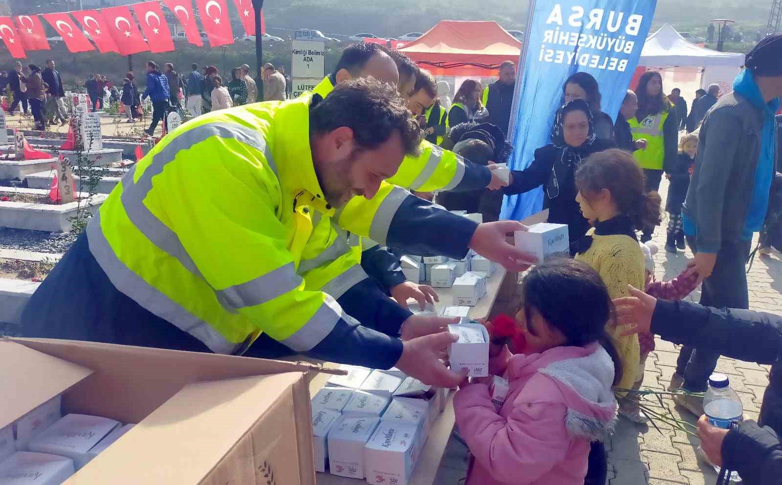 Asrın felaketinin yıldönümünde yaşamını yitiren vatandaşların mezarlarına karanfil bırakan Büyükşehir Belediyesi ekipleri, mezarlık girişine kurulan stantta vatandaşlara kandil simidi ve süt dağıttı. Bunun yanında yaklaşık 10 bin kişinin yaşamını sürdürdüğü Büyükşehir Belediyesi’nin konteyner kentlerindeki afetzedelere de kandil simidi ve süt dağıtılırken, etkinliklerde çocuklar da unutulmadı.