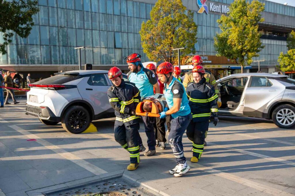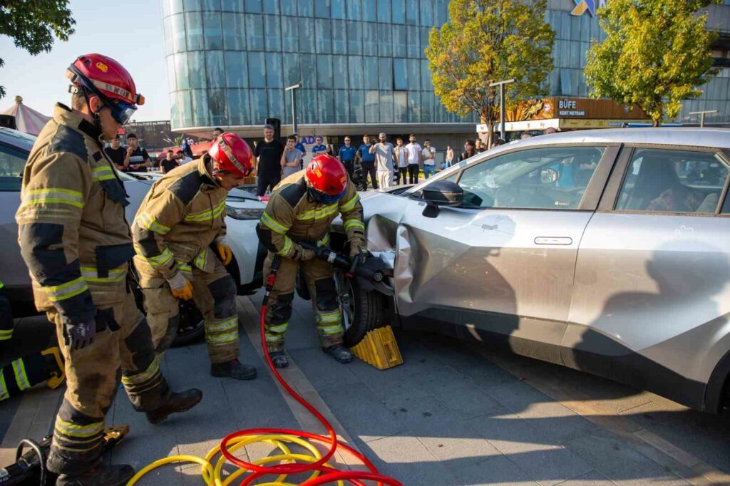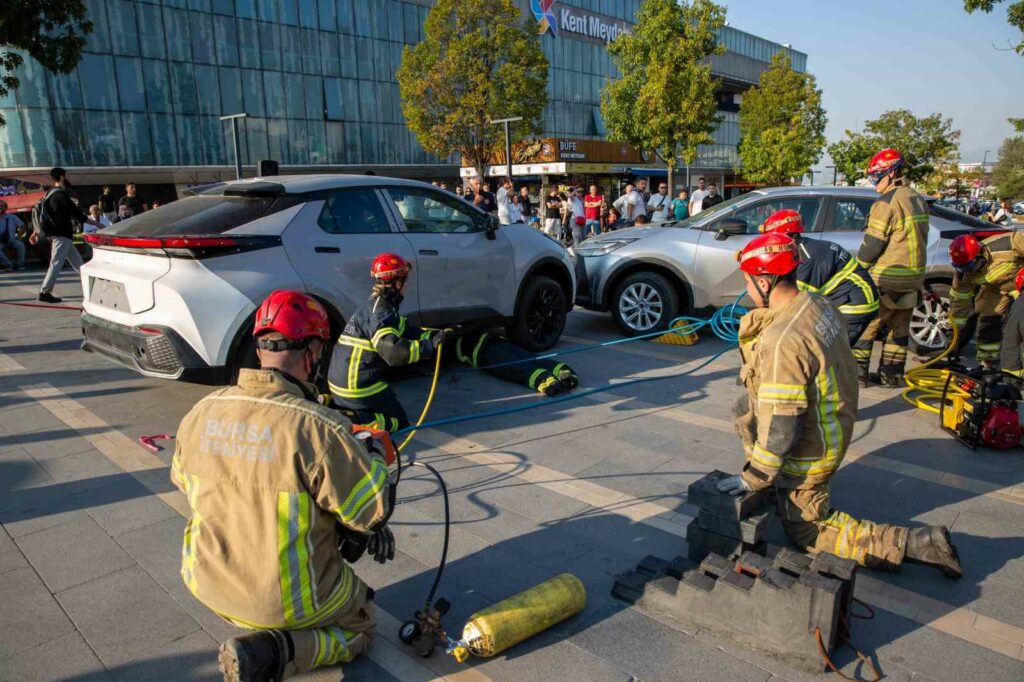 Bursa Büyükşehir Belediyesi İtfaiye Daire Başkanlığı’nın UMKE ekipleriyle ortaklaşa yaptığı trafik kazası yaralı kurtarma tatbikatı gerçeği aratmadı. İtfaiye Haftası etkinlikleri çerçevesinde yapılan tatbikatta, iki elektrikli aracın kazası sonrasında ekiplerin müdahalesi ve çalışması vatandaşlar tarafından ilgiyle takip edildi.