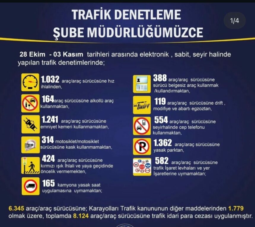 Bursa Emniyet Müdürlüğü’nün paylaştığı verilere göre; 7341 araç ve araç sürücüsüne, Karayolları Trafik Kanunu’nun diğer maddelerinden 2030 olmak üzere, toplamda 9371 araç/araç sürücüsüne trafik idari para cezalarının uygulandığı bildirildi. İl Emniyet Müdürlüğü sosyal medyada paylaştığı bilançoda, bin 32 sürücüye ‘hız sınırını’ aşmaktan 164 sürücüye alkollü araç kullanmaktan, bin 241 sürücüye emniyet kemeri takmamaktan, 314 sürücüye kask takmamaktan, 424 sürücüye ışık ihlalinden, 165 kamyona yasak saat uygulamasından, 119 araç sürücüsüne drift yapmaktan, 388 sürücüye ehliyetsiz araç sürmekten 554 sürücüye seyir halinde cep telefonu kullanmaktan, bin 362 araç sürücüsüne yasak parktan, 582 araç sürücüsüne trafik kurallarına uymamaktan idari ceza uygulandı.