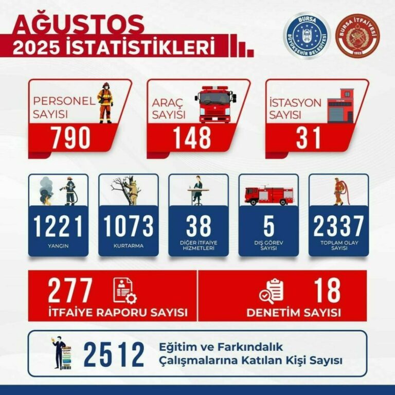 Bursa Büyükşehir Belediyesi’nin ekip, ekipman, hizmet binaları ve yeni araçlarla güçlendirmeye devam ettiği itfaiye teşkilatı, vatandaşların huzuru için gece gündüz demeden çalışmalarını sürdürüyor. Bursa’da 31 istasyonda 790 personel, 148 araçla hizmet veren İtfaiye Daire Başkanlığına bağlı ekipler, Ağustos ayında da birçok olaya müdahale etti.
