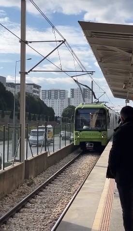 Bursa’da rüzgarda uçup metronun teline takılan poşet, seferlerin yarım saat boyunca durmasına sebep oldu.