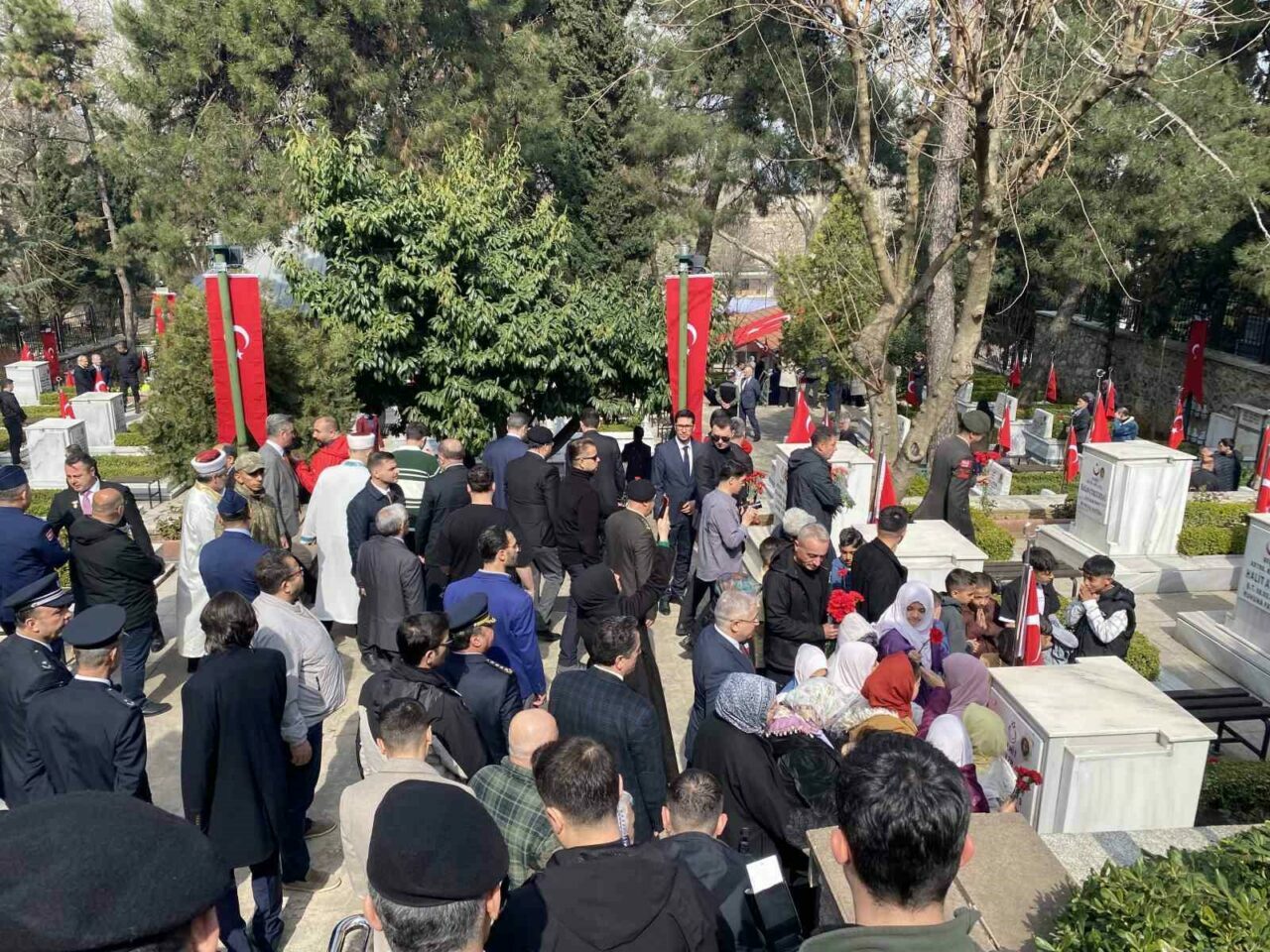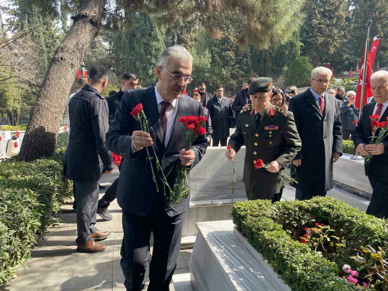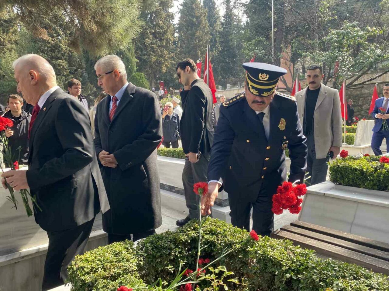 Bursa’da 18 Mart Şehitleri Anma Günü ve Çanakkale Zaferi’nin yıl dönümü dolayısıyla gerçekleştirilen törenlerin ardından kent protokolü Pınarbaşı Şehitliği’nde bir araya geldi. Program kapsamında şehit mezarlarına karanfiller bırakılırken, dualar edilerek Şehitlik Defteri imzalandı.