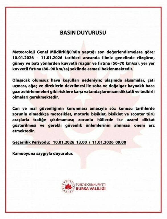 Valilikten yapılan açıklamada, 10-11 Ocak 2026 tarihleri arasında il genelinde rüzgârın 50-70 kilometre/saat hızla kuvvetli rüzgâr ve fırtına şeklinde, yer yer ise 80-90 kilometre/saat hızla kuvvetli fırtına olarak esmesinin beklendiği ifade edildi.