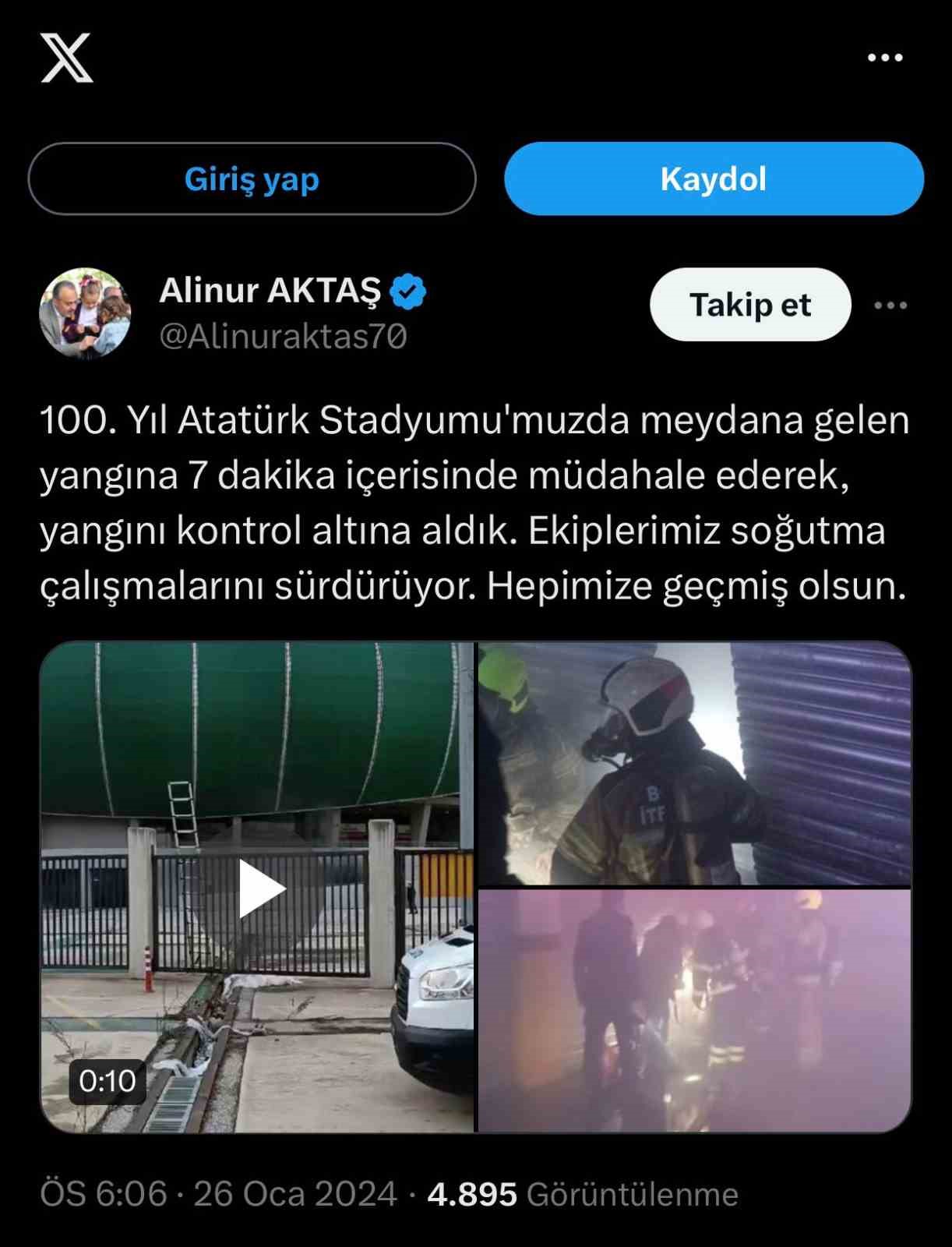 Bursa Büyükşehir Belediye Başkanı Alinur Aktaş, sosyal medya hesabından yaptığı açıklamada, “100. Yıl Atatürk Stadyumu’muzda meydana gelen yangına 7 dakika içerisinde müdahale ederek, yangını kontrol altına aldık. Ekiplerimiz soğutma çalışmalarını sürdürüyor” dedi.