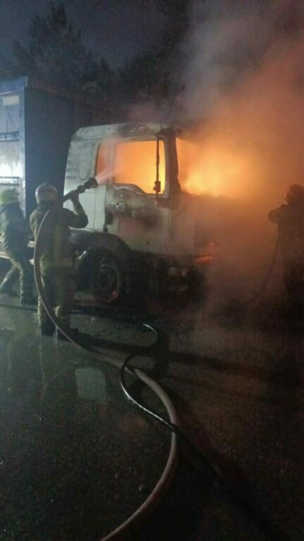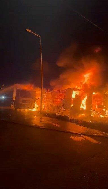Bursa’nın Osmangazi ilçesinde park halindeki 3 kamyon ve 1 tır alev alev yandı, ortalık savaş alanına döndü.