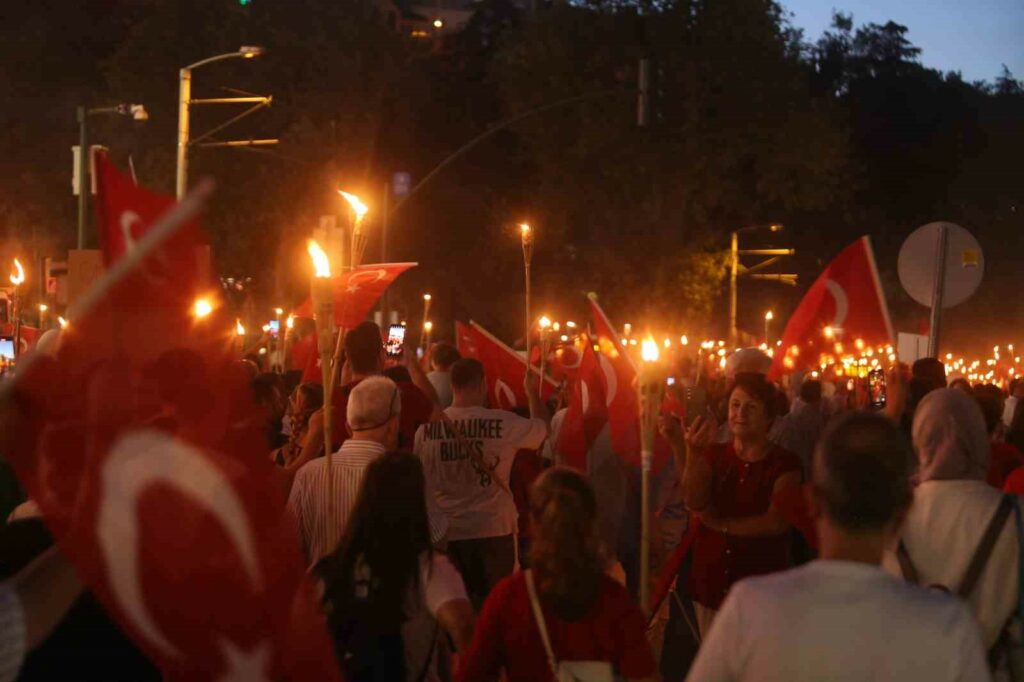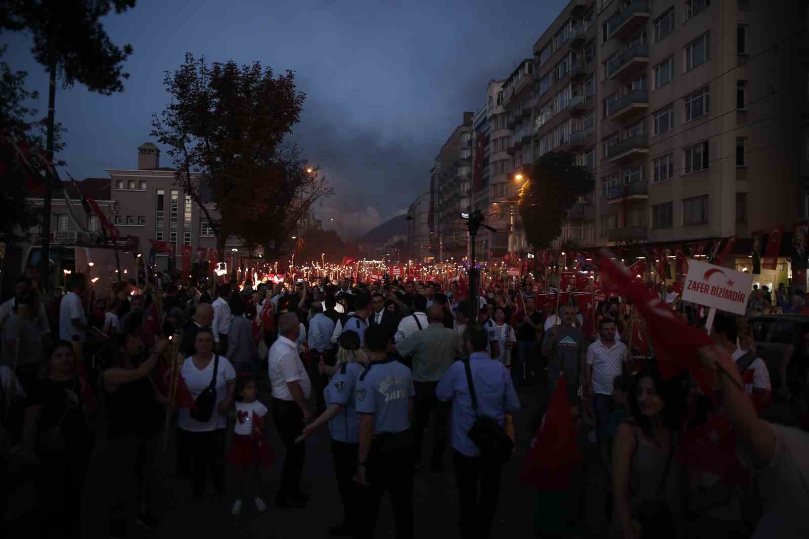 Heykel’deki tarihi belediye binası önünde başlayan yürüyüşe CHP Bursa Milletvekilleri Hasan Öztürk, Orhan Sarıbal, Bursa Büyükşehir Belediye Başkanı Mustafa Bozbey, Osmangazi Belediye Başkanı Erkan Aydın, CHP İl Başkanı, yöneticiler, partililer ve binlerce Bursalı katıldı. Çakırhamam ve Altıparmak Caddesi’ni takip eden fener alayı Atatürk Stadyumu Meydanı’na geldi.
