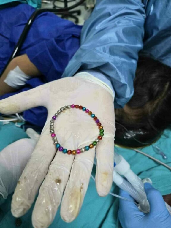Bursa Yüksek İhtisas Eğitim ve Araştırma Hastanesi’nde, mıknatıslı boncuk bileklik yutan 5 yaşındaki kız çocuğunun bağırsağından 38 adet mıknatıs çıkartıldı.