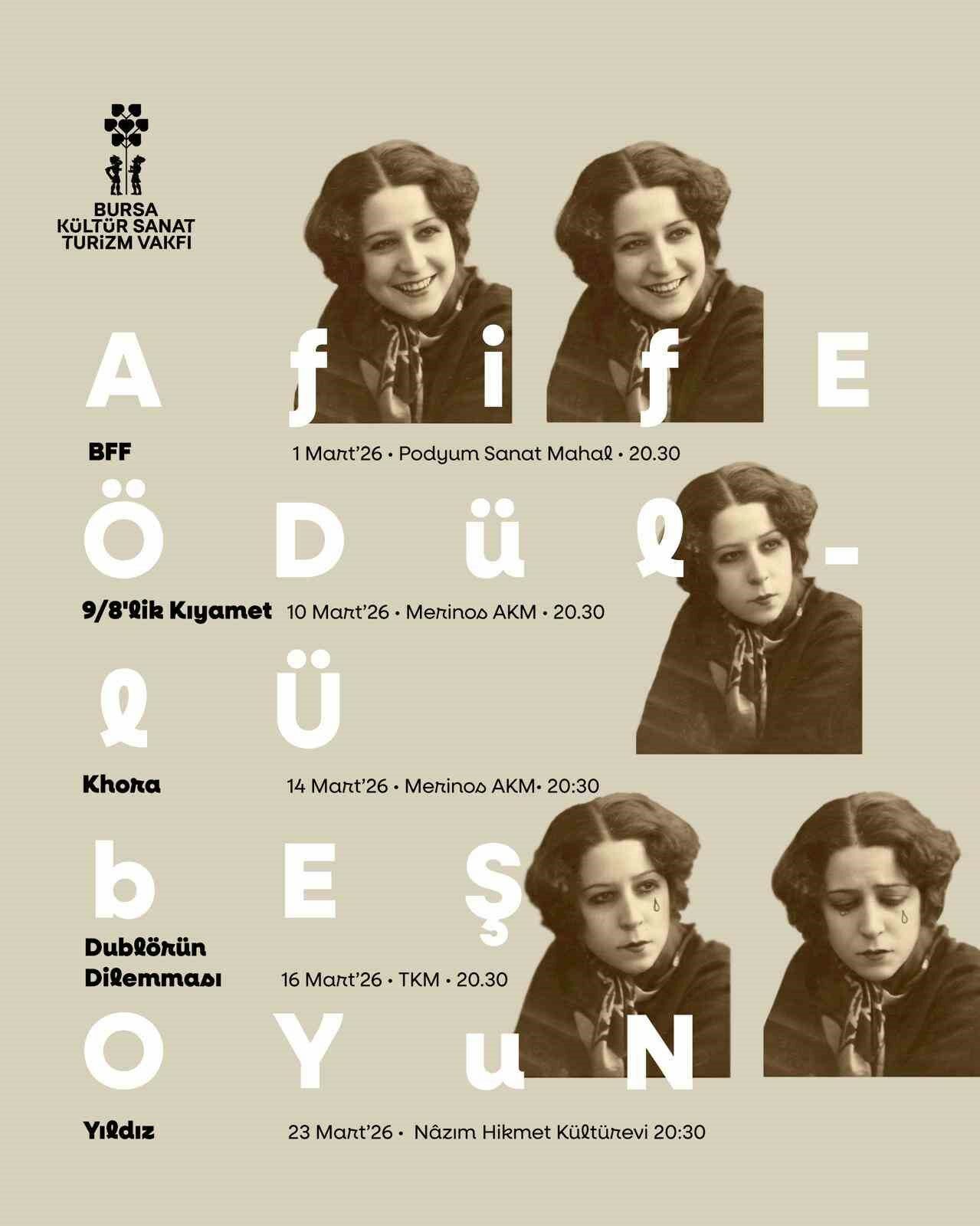Bursa Büyükşehir Belediyesi, Türk tiyatrosunda iz bırakan Afife Jale’nin anısına Mart ayı boyunca ‘Afife Tiyatro Günleri’ düzenliyor.
