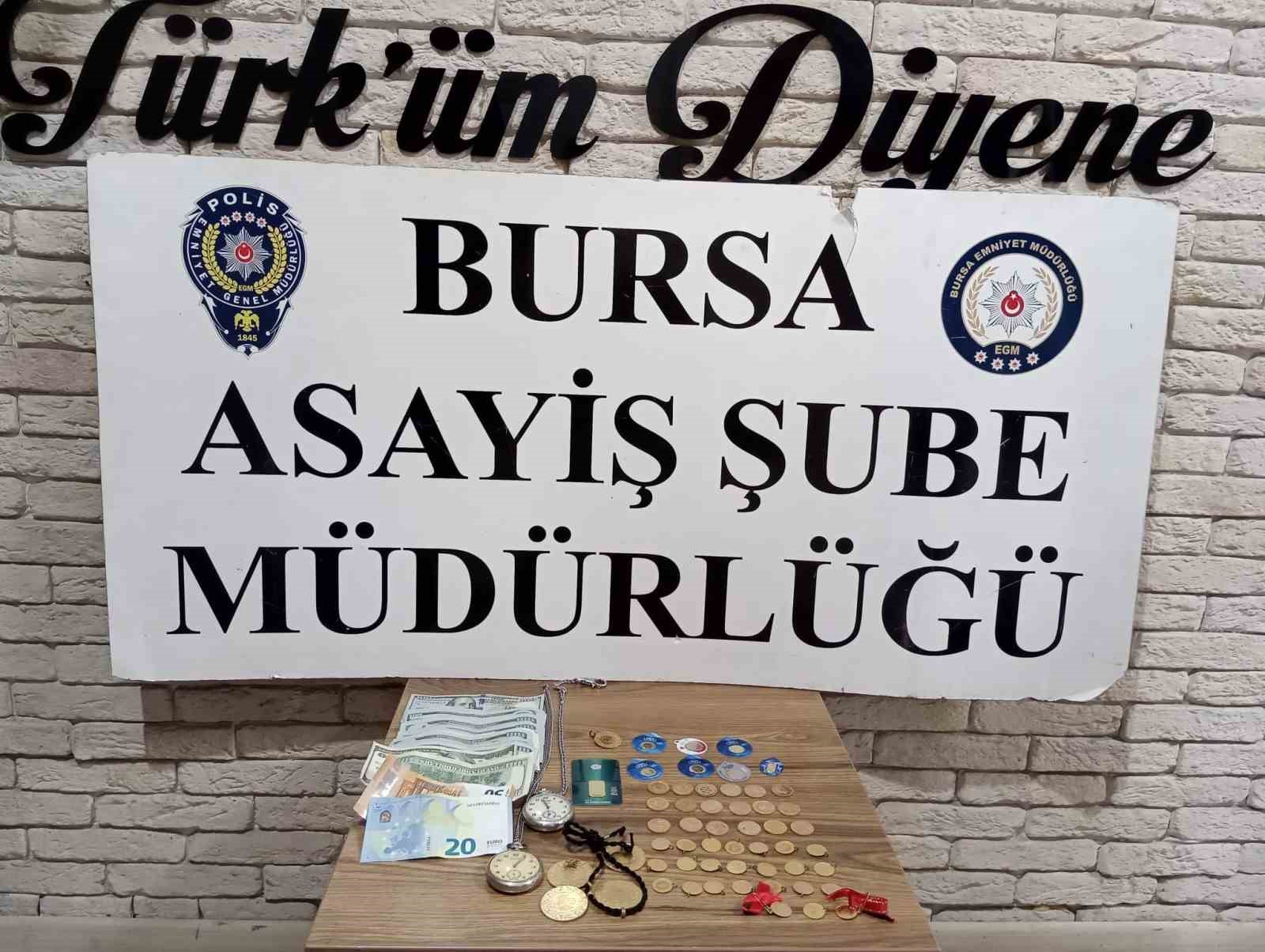 Olay, merkez Osmangazi ilçesi Sakarya Mahallesi’nde meydana geldi. Edinilen bilgiye göre, bir evin çatısına sahibi tarafından 15 cumhuriyet altını, 50 çeyrek altın, 4 tam altın, 4 bin dolar, inci kolye ve 2 köstebekli saatin ve depodan bisiklet ile kaynak makinasının çalındığının ihbarı üzerine Asayiş Şube Müdürlüğü Hırsızlık Büro Amirliği ekipleri harekete geçti. Bölgede bulunan güvenlik kameralarını izleyen ekipler, kısa sürede şüphelinin kimliği tespit etti. Şüphelinin Rıdvan Z. (30) olduğu tespit edildi. Şüpheli Rıdvan Z.’nin bir apartta saklandığını ve Balıkesir’e gitmek üzere olduğunu tespit etmesiyle birlikte kısa sürede yakaladı. Ekipler, yaptıkları aramalarda çalınan ziynet eşya ve dövizlerin ile bisiklet ve kaynak makinesini ele geçirerek sahiplerine teslim etti.