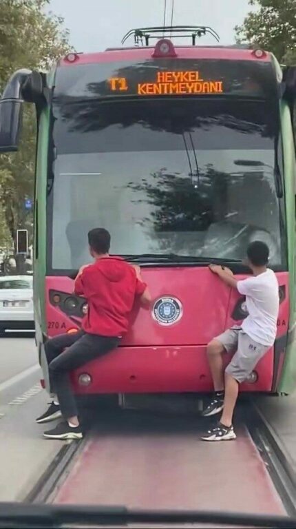 Bursa’nın Osmangazi ilçesinde yürekleri ağıza getiren anlar yaşandı. İki çocuk, seyir halindeki bir tramvayın arkasına tutunarak yolculuk yaptı. Dakikalarca trafikte ilerleyen çocukların tehlikeli yolculuğu, başka bir aracın kamerasına yansıdı. Her an düşüp ağır şekilde yaralanabilecekleri görüntüler izleyenlerin yüreğini ağzına getirdi. Çocukların rahat tavırları ise pes dedirtti.
