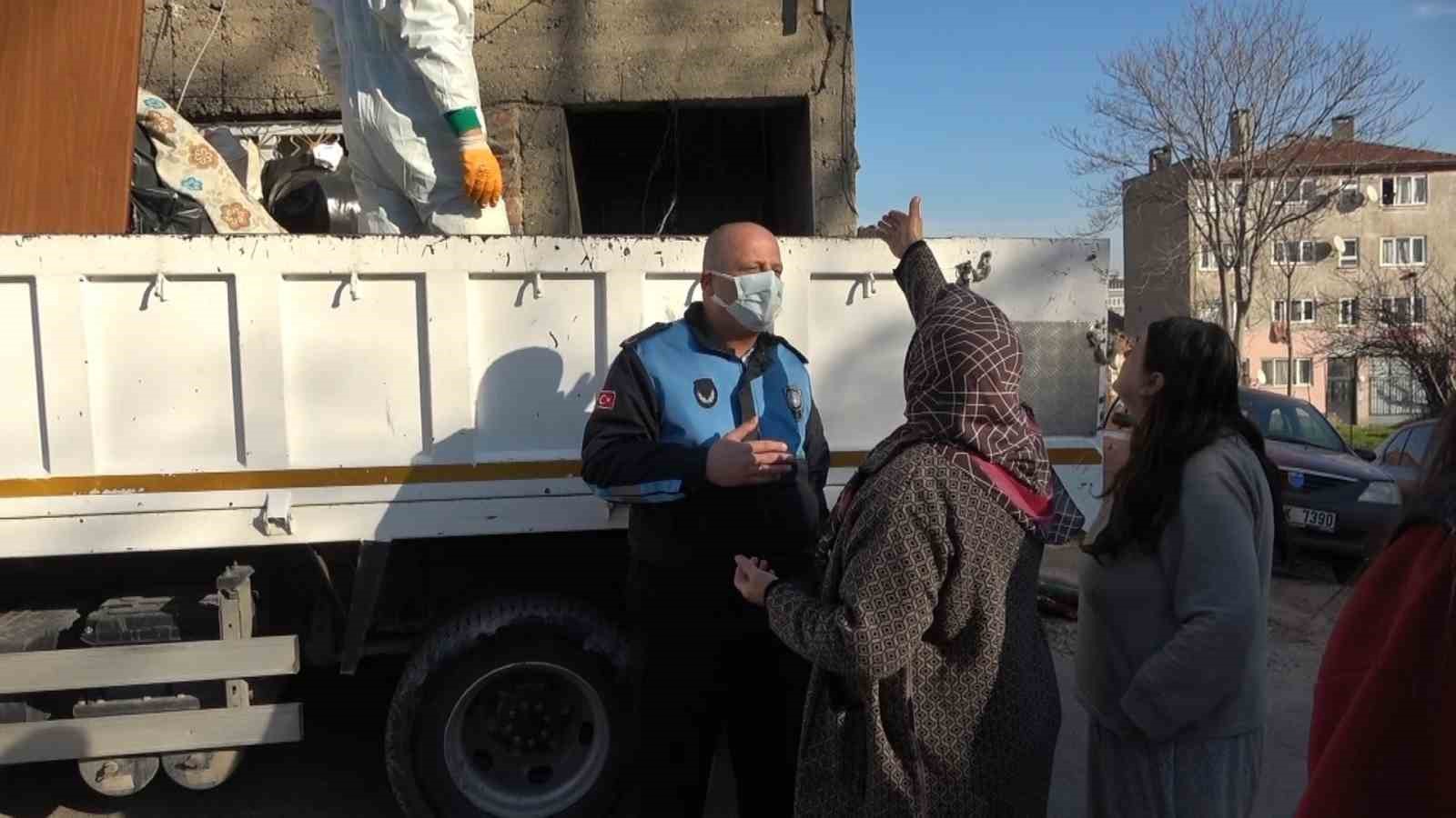 Savcılık kararı ile girilen evde ekipler çuval çuval çöp topladı. Evde engelli kızı ve hasta eşi ile birlikte yaşayan yaşlı kadın eşyalarının toplanması üzerine sinir krizi geçirdi.