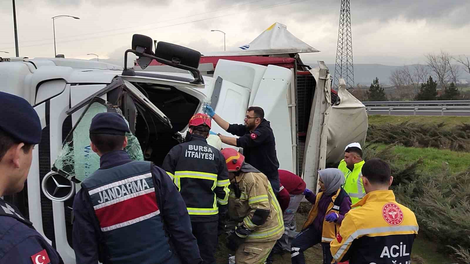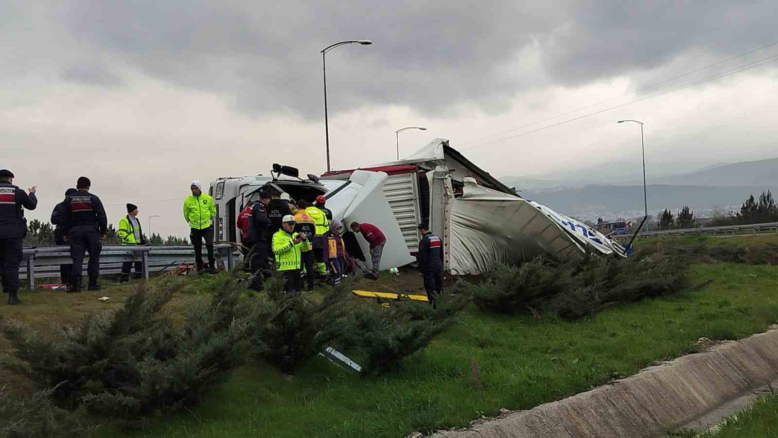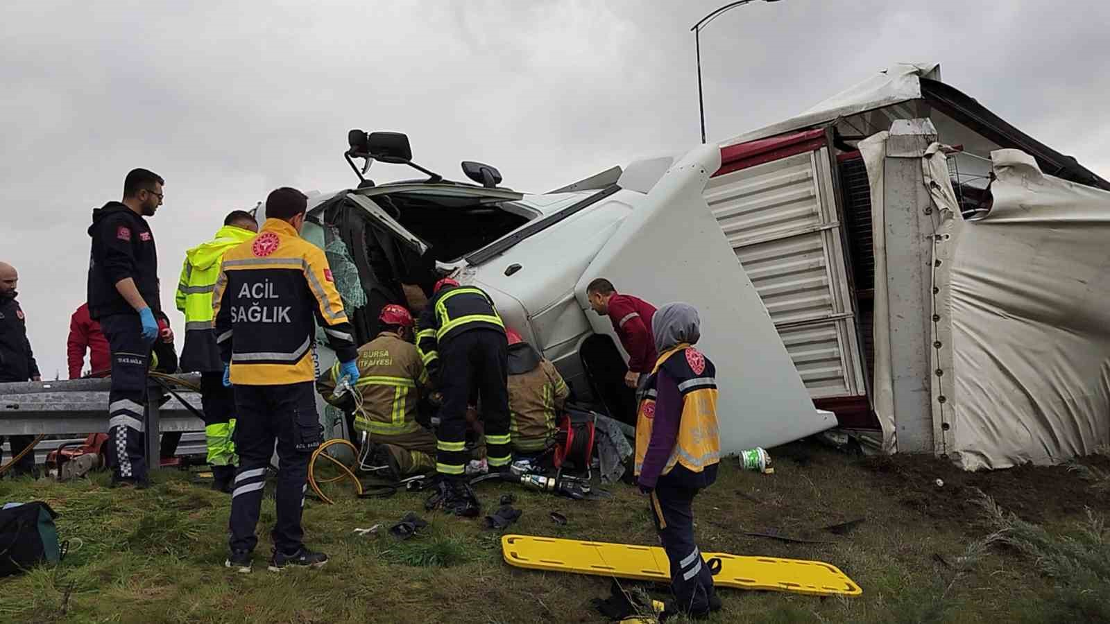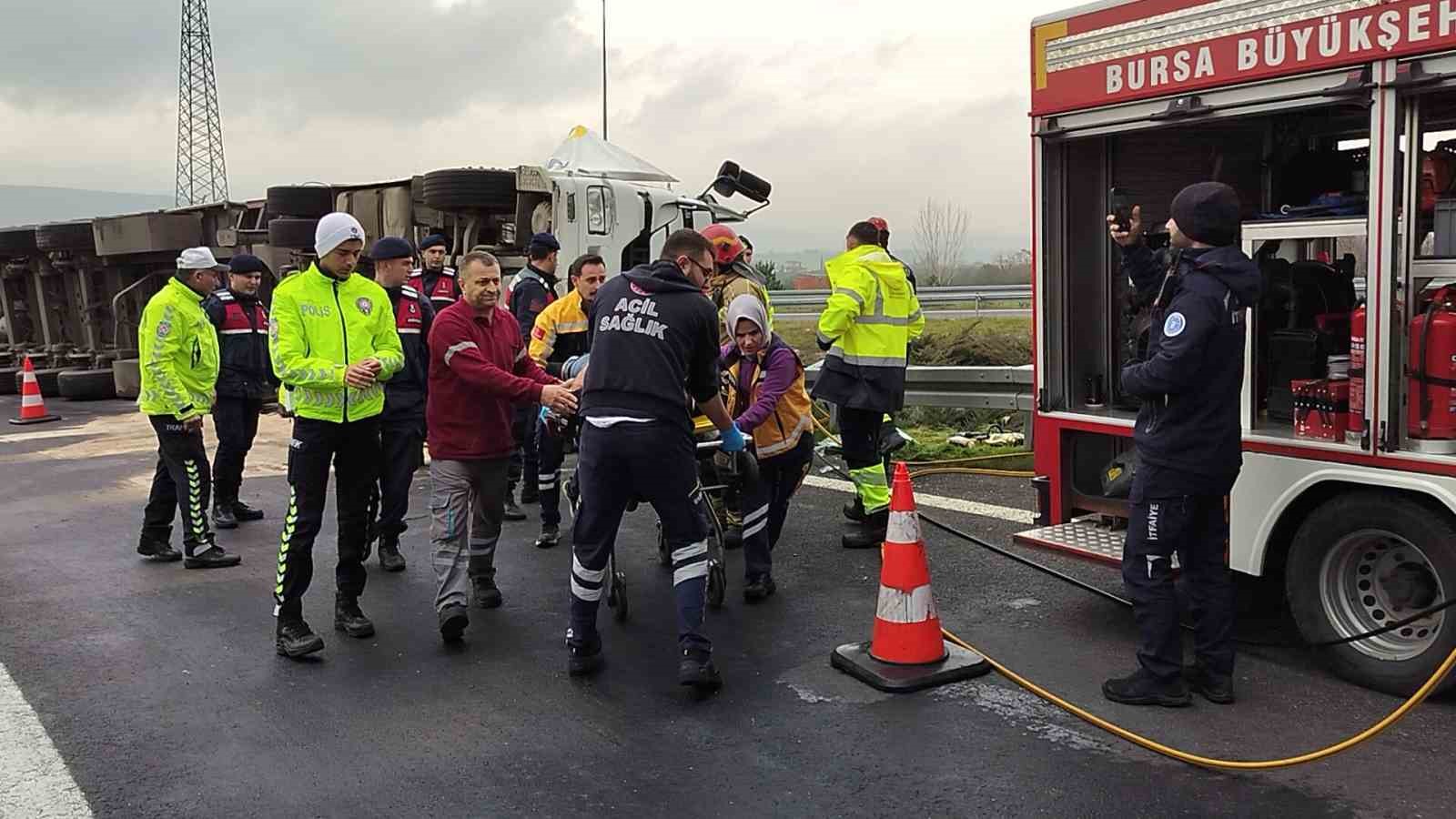 ,Edinilen bilgiye göre, Orhangazi kavşağında virajda kontrolden çıkan rulo halinde plastik kapı fitili yüklü bir tır devrildi. Tır içinde sıkışın sürücü, bölgeye gelen itfaiye ekiplerince çıkartıldı. Yaralı sürücü olay yerinde yapılan ilk müdahalenin ardından hastaneye kaldırılırken, kazayla ilgili soruşturma başlatıldı.