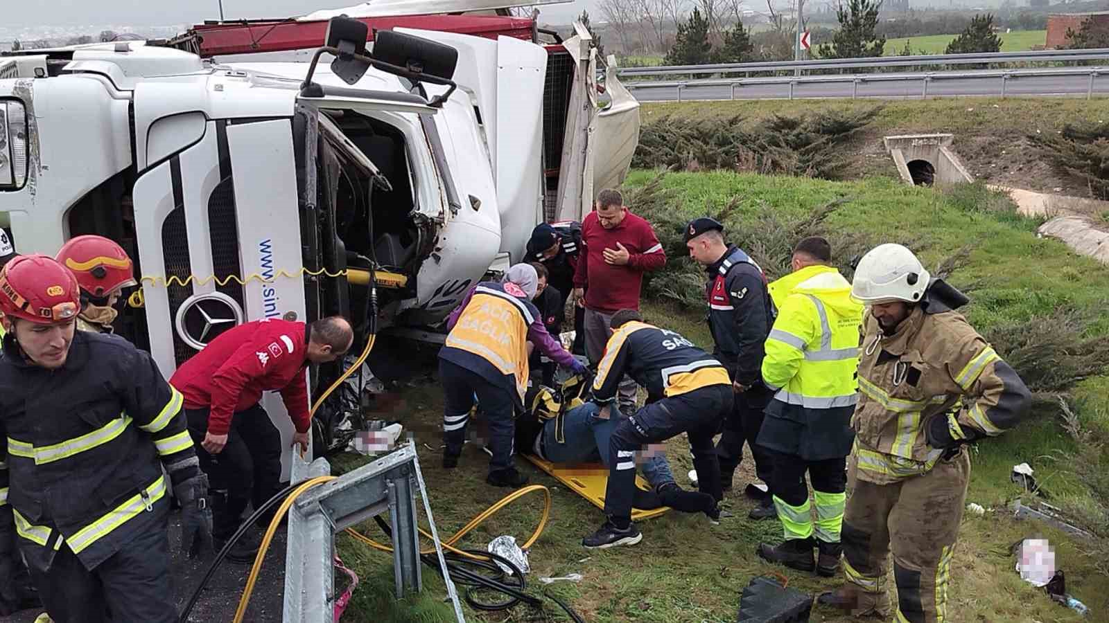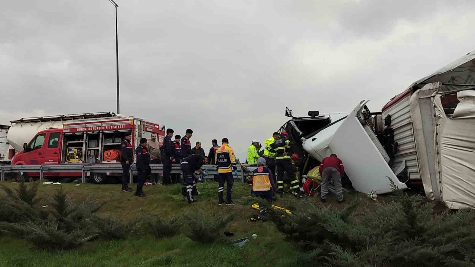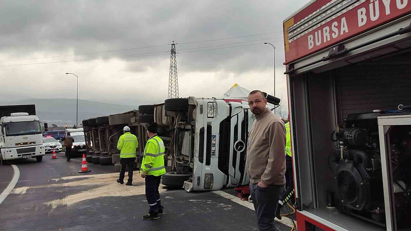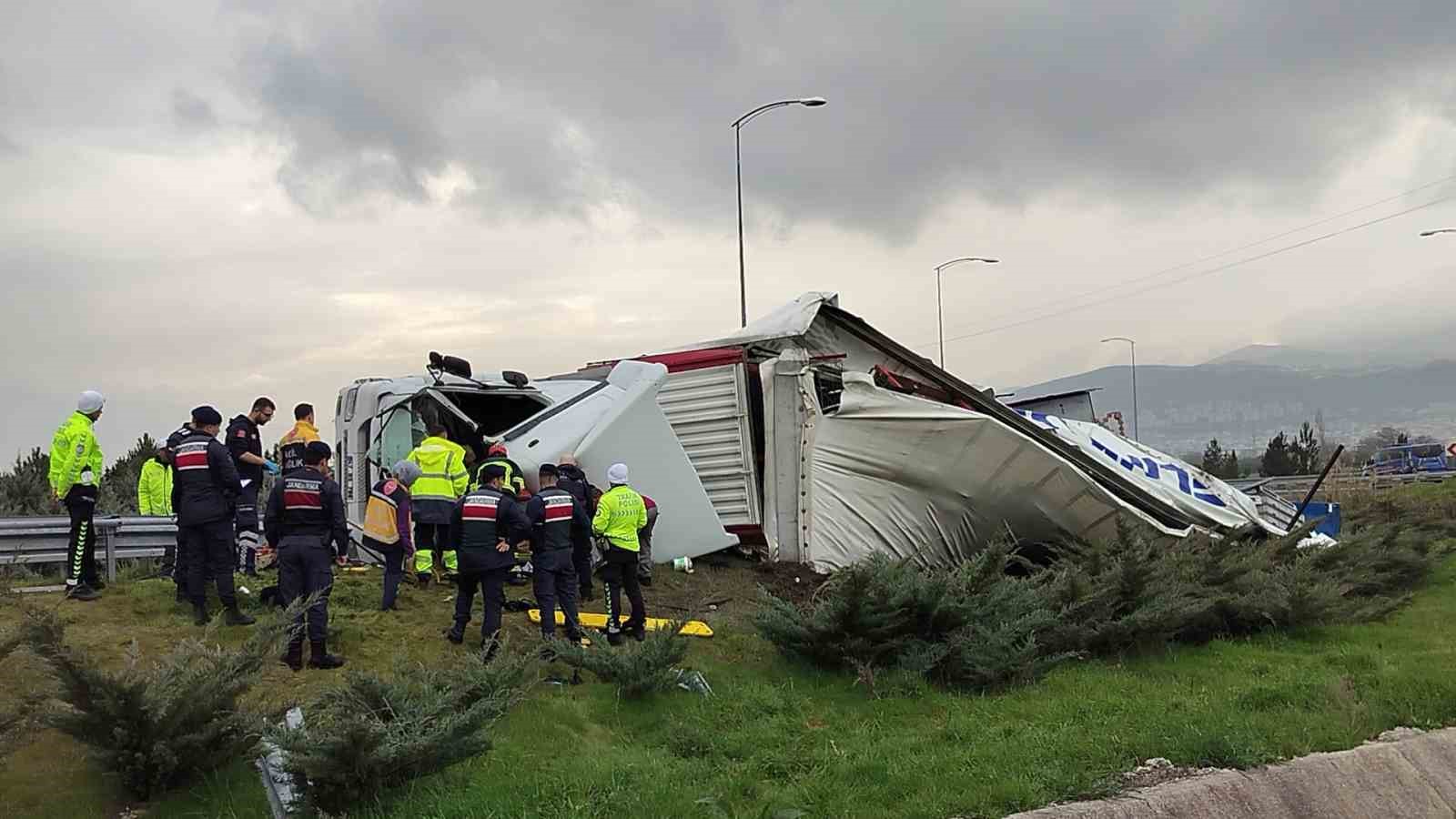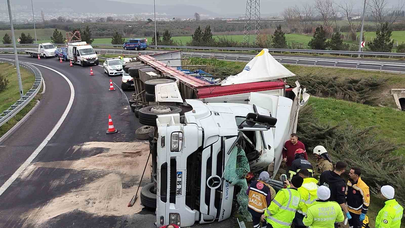 ,Edinilen bilgiye göre, Orhangazi kavşağında virajda kontrolden çıkan rulo halinde plastik kapı fitili yüklü bir tır devrildi. Tır içinde sıkışın sürücü, bölgeye gelen itfaiye ekiplerince çıkartıldı. Yaralı sürücü olay yerinde yapılan ilk müdahalenin ardından hastaneye kaldırılırken, kazayla ilgili soruşturma başlatıldı.