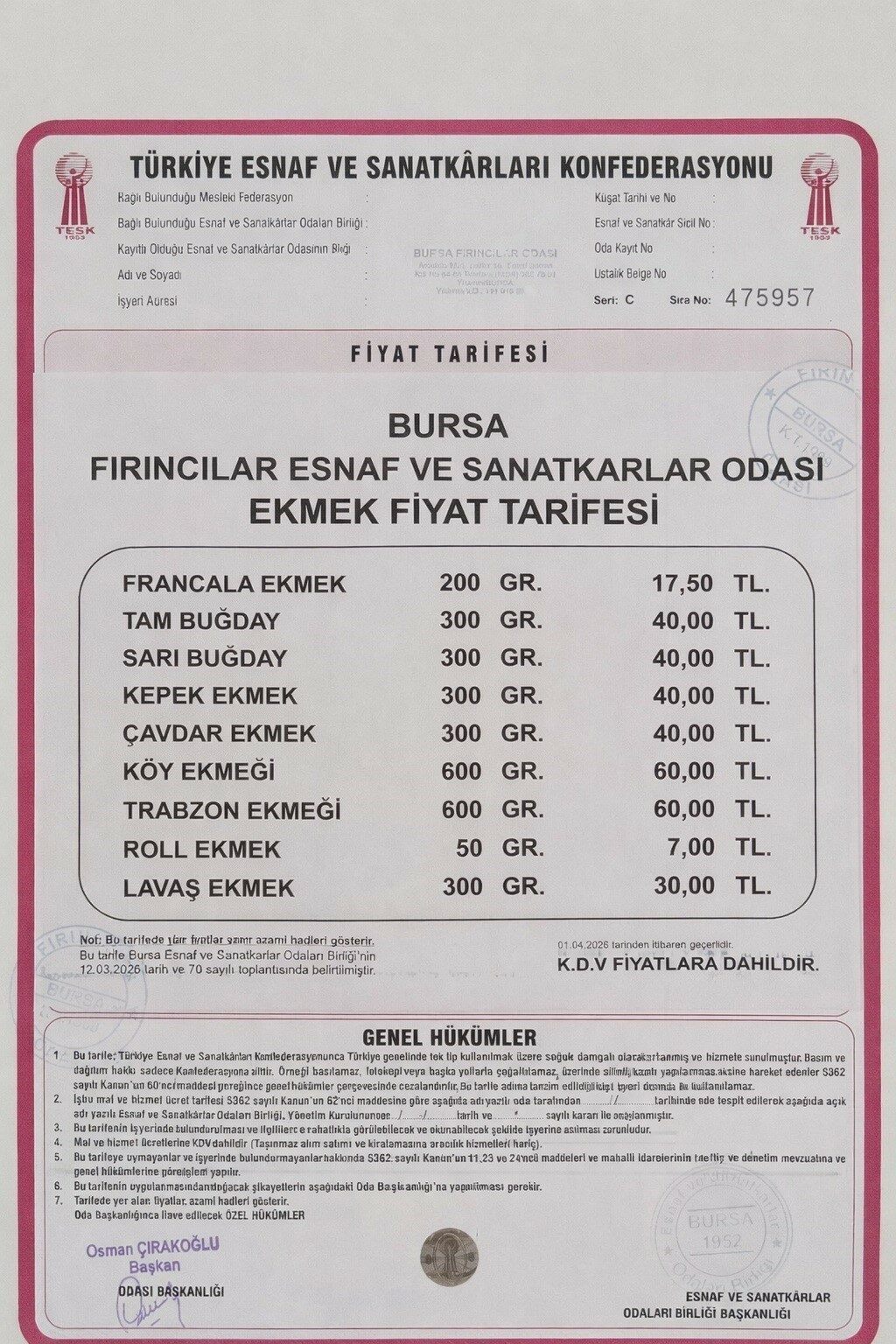 Bursa’da ekmek fiyatlarına gelen zam, 1 Nisan tarihi itibariyle geçerli olacak. Bursa Fırıncılar Odası Başkanı Osman Çırakoğlu, yapılan zammın, 2025 yılının son 3 ayının farkı olduğunu, 2026 yılında gelen zamların yansıtılmadığını söyledi.