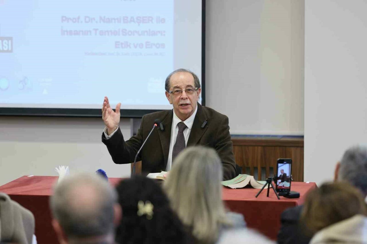 Kültür, Sanat ve Sosyal İşler Dairesi Başkanlığı tarafından Tayyare Kültür Merkezi’nde gerçekleştirilen programa, felsefe meraklıları yoğun ilgi gösterdi. İnsan ve Felsefe’ temalı söyleşinin yürütücülüğünü Prof. Dr. Kadir Çüçen ve Ceren İplikçi üstlendi. Programa konuşmacı olarak katılan Prof. Dr. Nami Başer, ‘İnsanın Temel Sorunları: Etik ve Eros’ başlığında varlığın temel taşlarını felsefi bir bakış açısıyla ele aldı. Etkinliğin sonunda Kültür, Sanat ve Sosyal İşler Dairesi Başkanı Şafak Baba Pala tarafından Prof. Dr. Nami Başer’e hediye verildi.