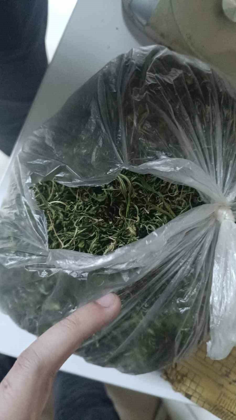 Evde yapılan aramalarda; 2 adet ruhsatsız tabanca, 67 adet fişek, 5 parça halinde toplam 728 gram esrar, 9 parça halinde 146 gram esrar tohumu, 2 kök hint keneviri, 86 adet şeffaf kilitli poşet, 1 adet havalı tüfek ve 2 adet hassas terazi ele geçirildi.
