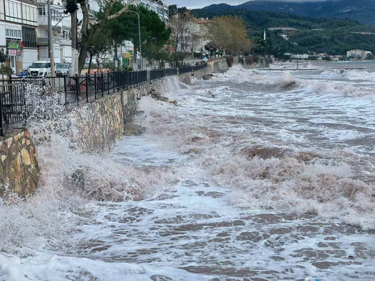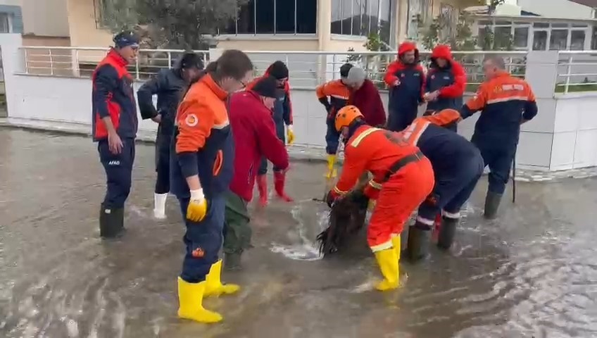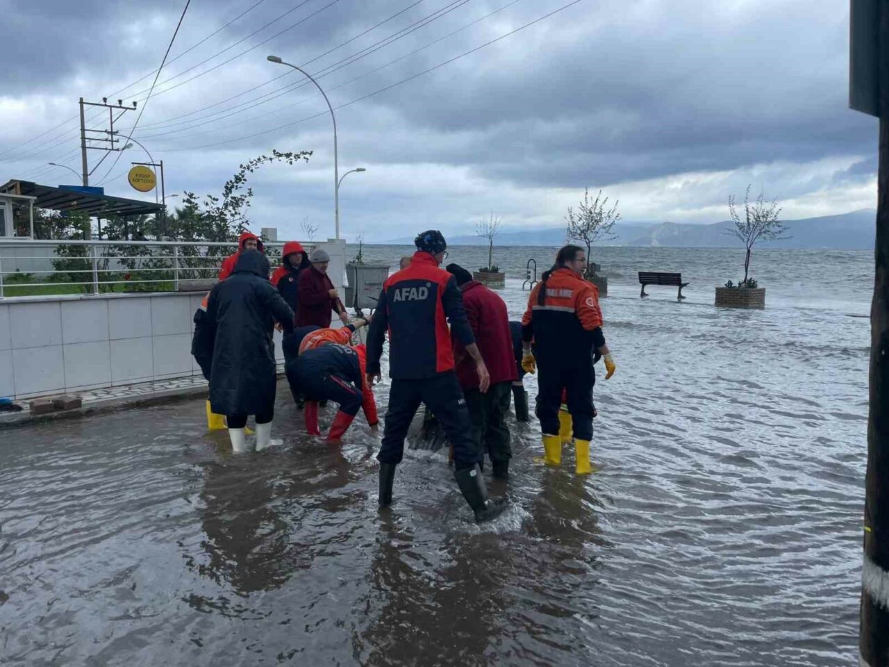Bursa’nın birçok noktasında etkili olan fırtına ve yağış en çok Gemlik ilçesine bağlı Kurşunlu Mahallesi’ni vurdu. Deniz, sahil yoluna taşarken ekipler rögar kapaklarını açmak için büyük gayret sarf etti.
