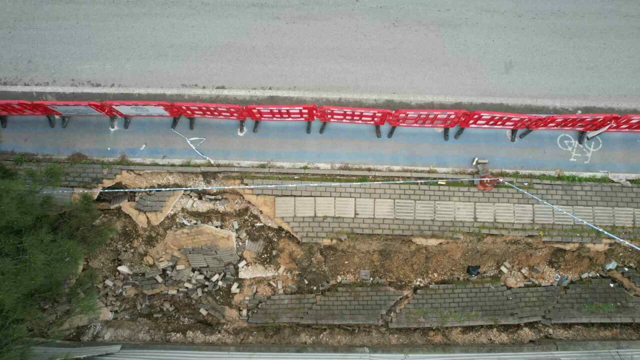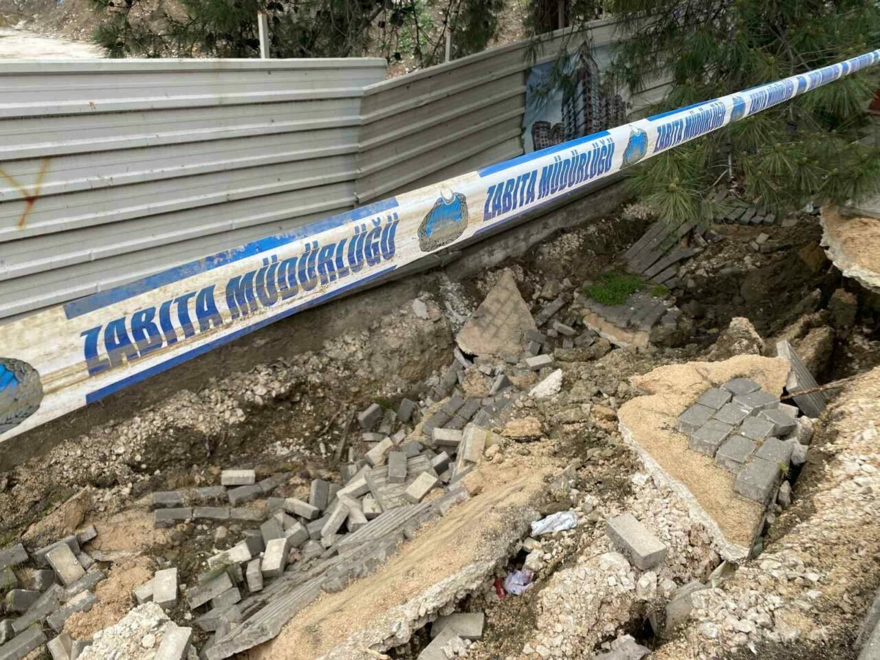 BURSA’NIN NİLÜFER İLÇESİNE BAĞLI ATAEVLER MAHALLESİ’NDE KENTSEL DÖNÜŞÜM ÇALIŞMASININ SÜRDÜĞÜ BİR İNŞAAT ALANININ YANINDA BULUNAN İSTİNAT DUVARININ ÇÖKMESİ SONUCU YAYA YOLUNDA HASAR OLUŞTU.