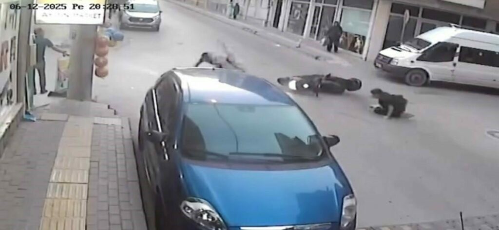 O anlar, çevrede bulunan bir iş yerinin güvenlik kamerasına saniye saniye yansıdı. Görüntülerde iki motosikletin çarpışma anı ve çevredekilerin yardıma koştuğu anlar yer aldı.