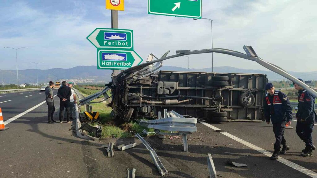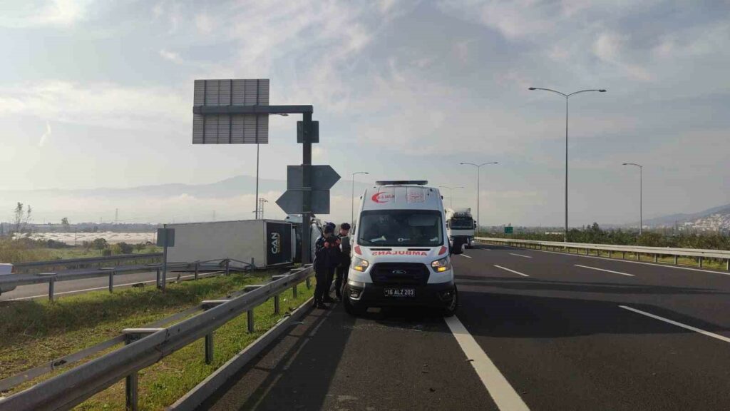 Bursa Orhangazi’de otoyol kavşağı çıkışında kontrolden çıkan bir kamyonet bariyere çarparak devrildi. Hurdaya dönen kamyonetin sürücüsü şans eseri kazayı hafif sıyrıklarla atlattı.