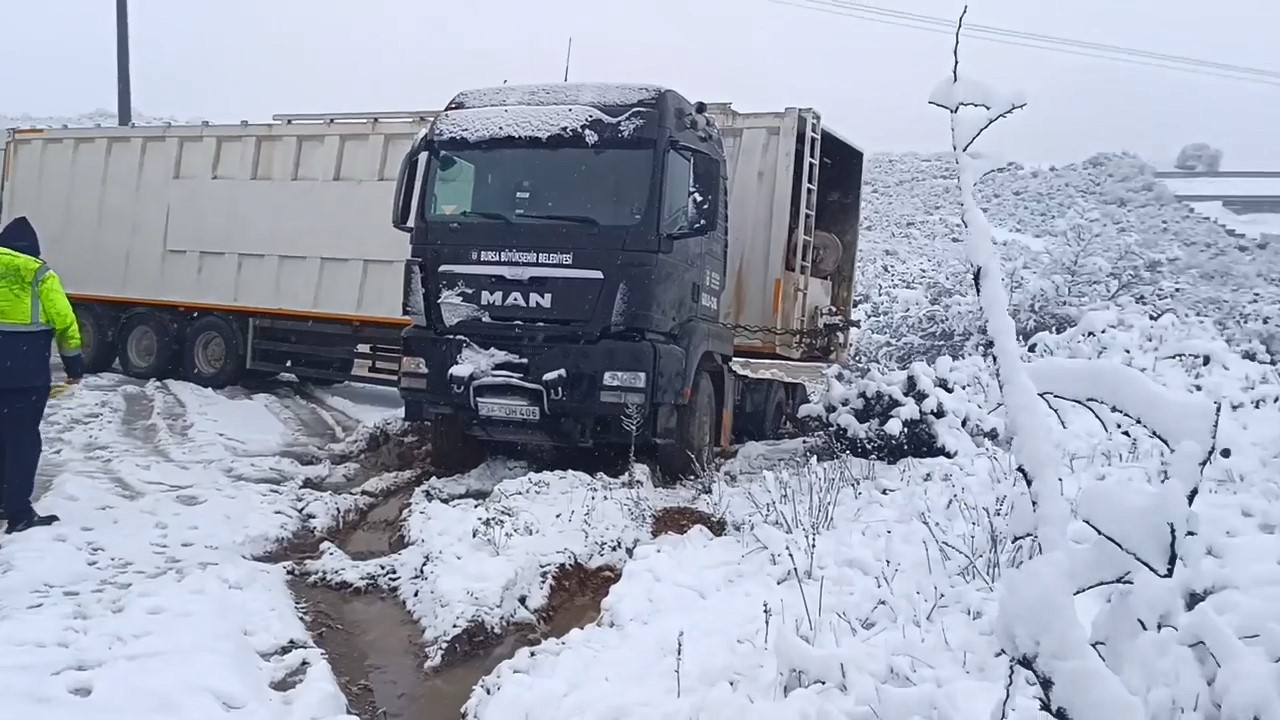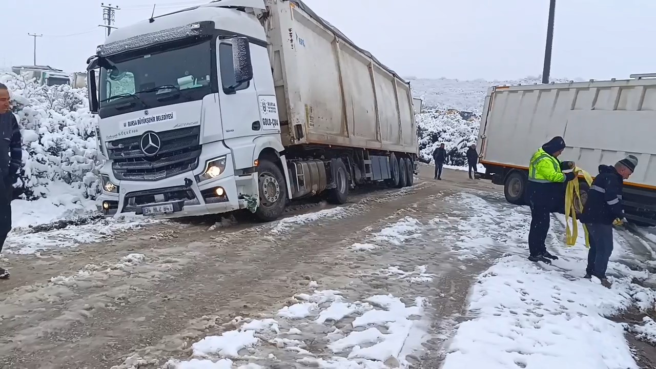 Bursa’da yağan kar sonrası tırlar yolda kaldı. O anlar vatandaş kamerasına yansıdı.