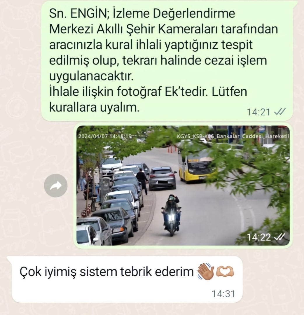 Bursa’nın İnegöl ilçesinde belediye tarafından kurulan İzleme ve Değerlendirme Merkezi ile şehir 7/24 takip ediliyor. İhlalin türüne göre sürücülere whatsapp üzerinden anlık olarak fotoğrafla uyarı yapılıyor. Sürücülerin uygulamadan memnun olduğu öğrenildi.