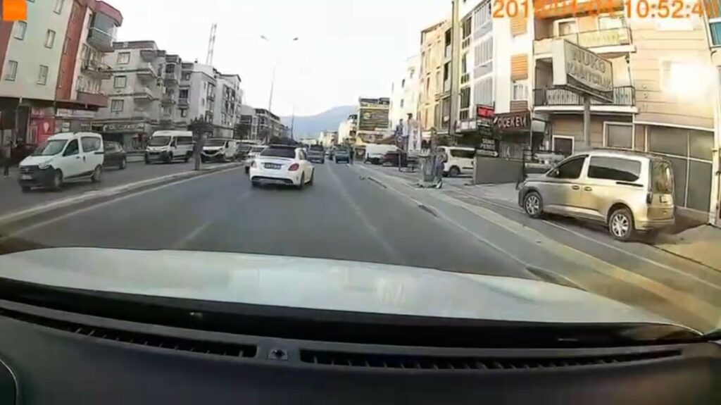 Bursa’da makas atan otomobil, anne ile bebeğine çarpmaktan kıl payı kurtuldu. O anlar arkadan gelen başka bir aracın kamerasına yansıdı.