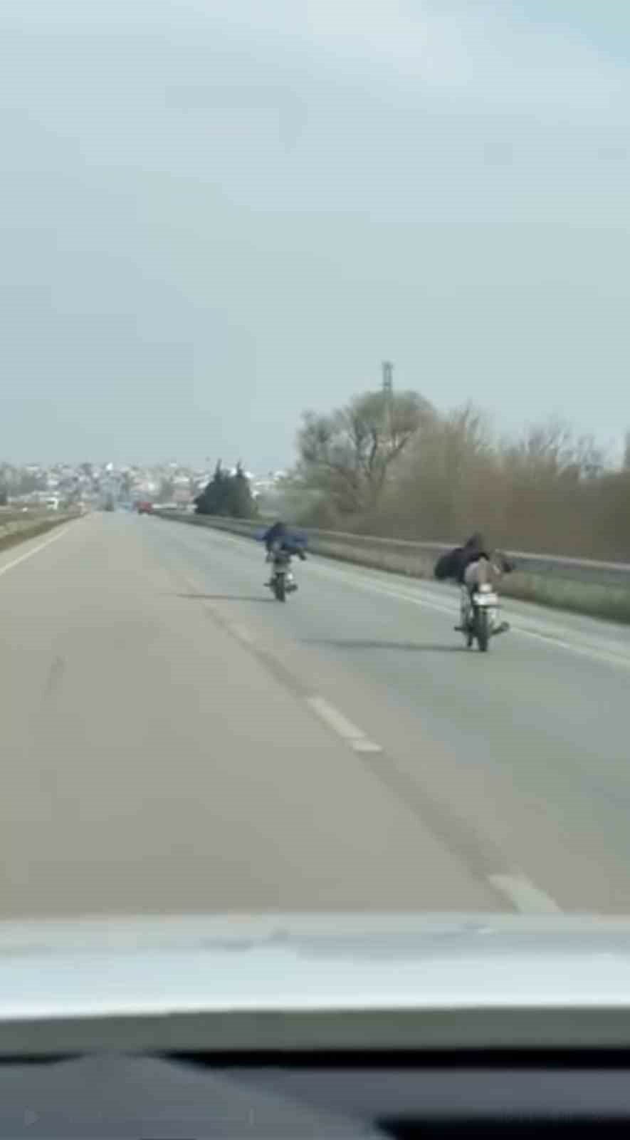 Bursa’da karayolunda kaydedilen görüntüler trafikteki tehlikeyi bir kez daha gözler önüne serdi. İki motosiklet sürücüsünün yüksek hızda motosiklet üzerine uzanarak yaptığı tehlikeli yolculuk cep telefonu kamerasına yansıdı.
