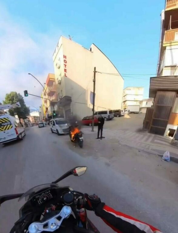 Bursa’da park halindeki bir motosiklet, bir anda alev topuna döndü. O sırada olay yerinde bulunan bir vatandaş, eline geçirdiği vileda kovasını kaptığı gibi suyla motoru söndürdü. O anlar kameraya yansıdı.