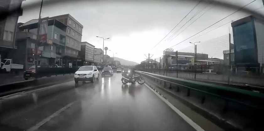 Bursa’da merkez Yıldırım ilçesi Ankara Yolu üzerinde seyir halindeki bir motosiklet sürücüsü yağışlı havanın etkisiyle kayganlaşan yolda dengesini kaybederek düştü. Sol şeritte ilerleyen motosikletlinin arkasında seyreden otomobil sürücüsünün, kayarak düşen sürücüye çarpmamak için ani fren yaparak durabilmesi facianın önüne geçti. Kazanın yaşandığı o anlar başka bir aracın kamerasına yansıdı.