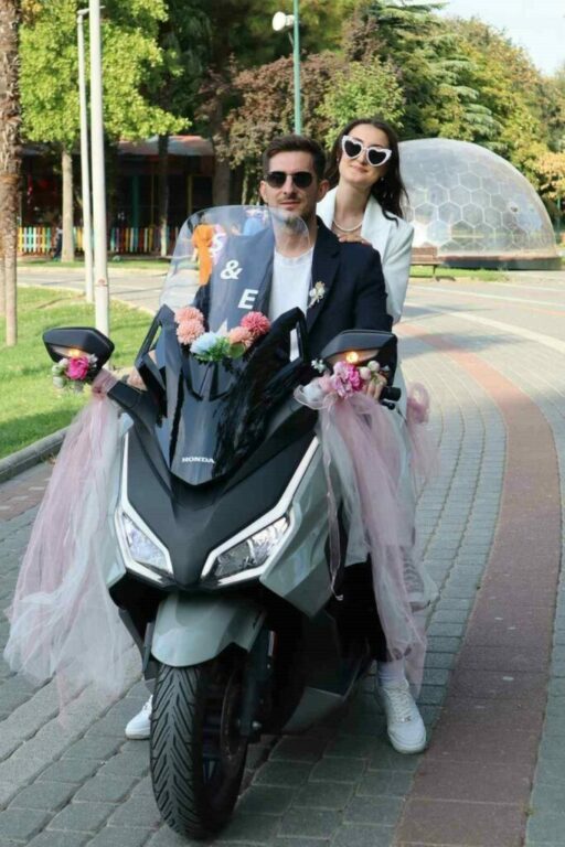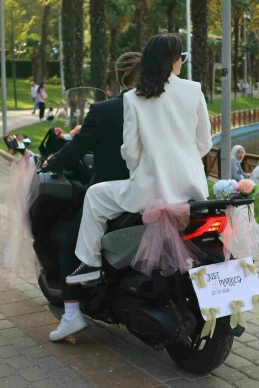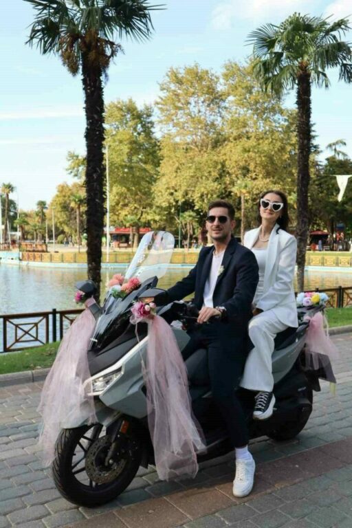 Nikâhın ardından motosikletlerini çiçek ve tüllerle süsleyen çift, düğün konvoyuna ilginç bir renk kattı. Gelinlik yerine beyaz takım tercih eden Şule Albayrak Çağın ve damat Emre Çağın, süslenmiş motosikletleriyle şehir turuna çıktı. Renkli görüntülere sahne olan anlarda çevredeki vatandaşlar çifti alkışlayarak mutluluklarına ortak oldu.