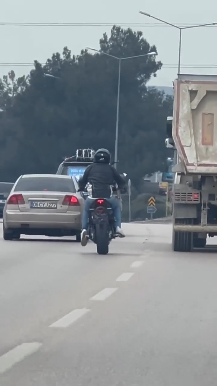 Olay, İzmir Yolu Caddesi üzerinde meydana geldi. Kendi canını hiçe sayan bir motosiklet sürücüsü plakasını kapatarak yola çıktı. Makas atarak ilerleyen sürücü, bir süre sonra tek teker ilerlemeye başladı. Kendi canını tehlikeye atan sürücüyü gören vatandaşlar, o anları anbean cep telefonu kamerası ile kaydetti.
