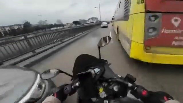 Olay, merkez Yıldırım ilçesi Ankara yolu üzerinde meydana geldi. Biranda hızlanan motosiklet sürücüsü, otobüse çarpmamak için solundan giden otomobilin önüne geçtiği an direksiyon hakimiyetini kaybetti. Sağa ve sola doğru yalpalayan motosiklet, sürücüsü kısa bir süre sonra direksiyonu toplamasıyla yoluna devam etti. Yaşanan korku dolu anlar, motosikletlinin kask kamerasına yansıdı.