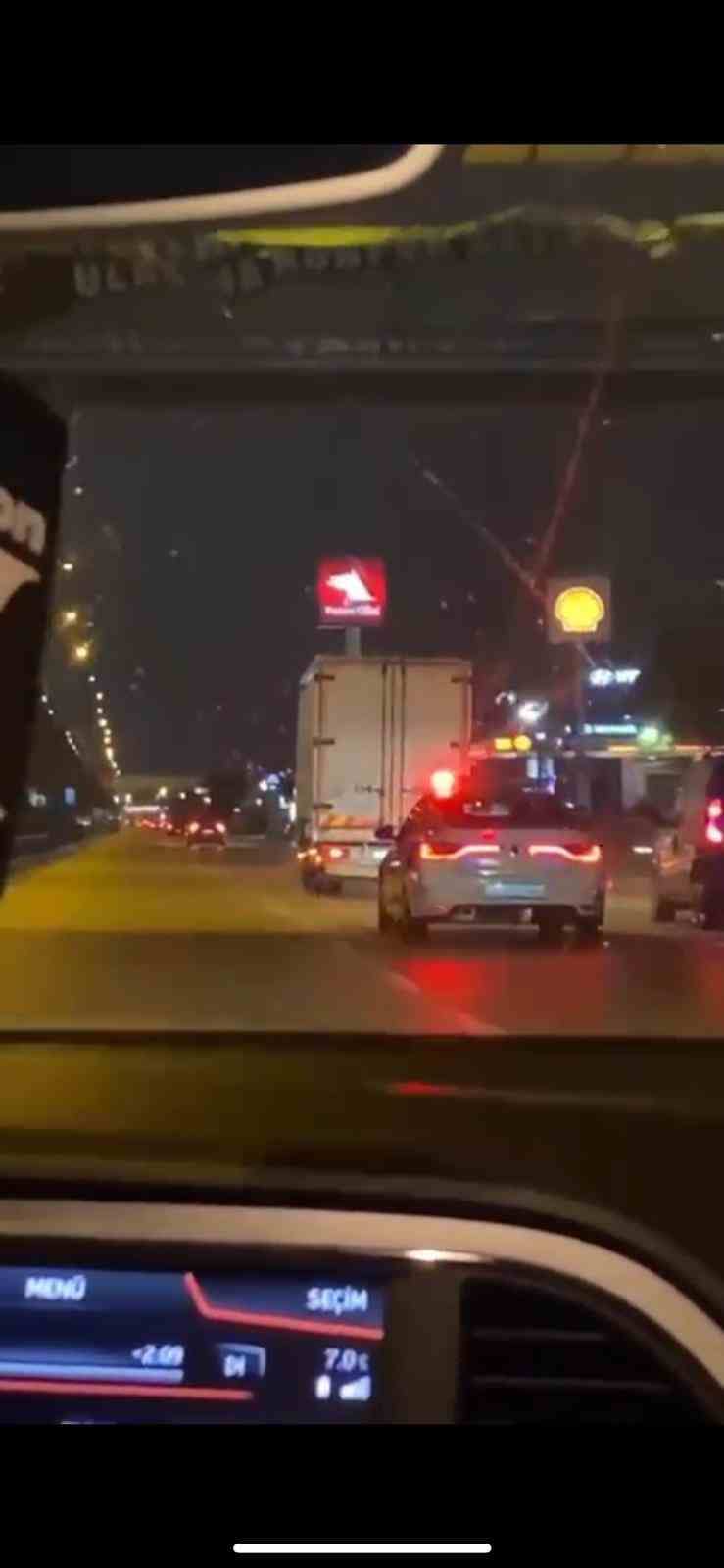 Bursa’da İzmir Caddesi’nde ilerleyen bir kamyonet sürücüsü polis ekiplerinin ‘dur’ ihtarına uymadı. Polis ekiplerinin peşine düşmesiyle başlayan kovalamaca İzmir Yolu, Ata Bulvarı ve Mudanya Caddesi’nde devam etti. Kovalamaca trafikteki diğer sürücülerin kamerasına yansırken, kamyonet sürücüsü, peşine takılan onca ekibe rağmen trafiği tehlikeye düşürüp inatla gaza bastı. Dakikalarca süren kovalamaca sonrası daha fazla kaçamayacağını anlayan kamyonet sürücüsü Akpınar Mahallesi’nde durmak zorunda kaldı. Polis ekiplerince işlem yapılan sürücünün direksiyon başına alkollü geçtiği için durmadığı öğrenildi. Sürücüye, kaçarken drift yapmak, trafiği tehlikeye düşürmek, alkollü araç sürmek ve dur ihtarına uymamak suçundan yaklaşık 40 bin lira ceza kesildi.