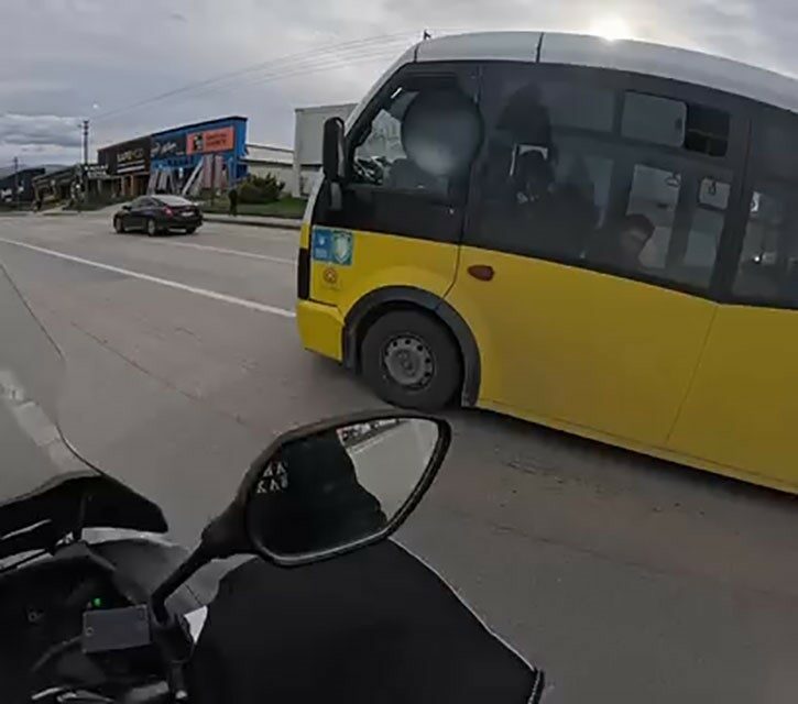 Bursa’da seyir halindeki motosiklet sürücüsü, aniden şeridine giren otobüs nedeniyle tehlike atlattı. Yaşanan gerginlik kask kamerasına saniye saniye yansıdı.