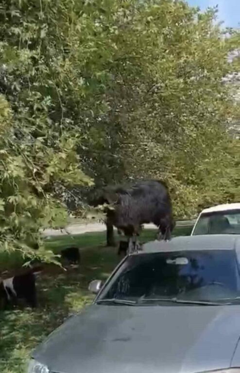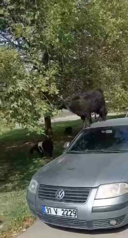 Keçiler, park halindeki otomobilin üzerine çıkarak yaprakları yemeye başladı.