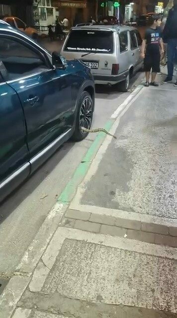Kısa süre içinde olay yerine gelen vatandaşlar, aracın jantından sarkan sarı ve siyah desenli yaklaşık 1 metre uzunluğundaki bir yılanla karşılaştı. Bazı mahalle sakinleri durumu cep telefonlarıyla kayda alırken, bazıları ise tedirgin oldu. Vatandaşlar yılanı nasıl alacağını düşünürken, kendiliğinden janttan çıkan yılan araçtan uzaklaştı.
