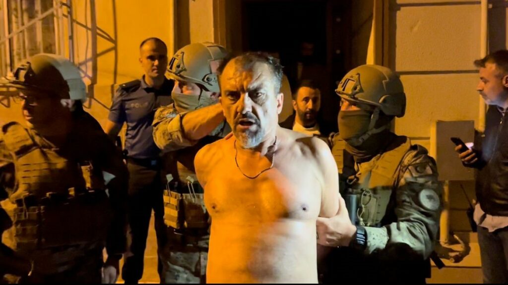 Bursa’da 26 suç kaydı bulunan eski bir boksör gece saatlerinde son ses müzik açıp mahalleyi ayağa kaldırdı. Şikayetçi olan komşular polisi aradı. Kapıya gelen polise silah çeken 44 yaşındaki şüpheli içeri girmek isteyen ekiplere bir türlü izin vermedi. Son çare olarak olay yerine gelen Özel Harekat Timleri kapıyı kırarak aldığı şüpheliyi ekiplere teslim ederken, basın mensuplarını gören saldırgan, “Allah’ın rahmeti üzerinize olsun” dedi.