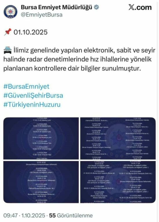 Bursa İl Emniyet Müdürlüğü, il genelinde gerçekleştirilen elektronik, sabit ve seyir halinde yapılan radar denetimlerine ilişkin yeni bir uygulamaya geçti. Buna göre Emniyet Müdürlüğü’nün sosyal medya hesaplarından denetim yapılacak noktalar ve saatleri açıklandı.