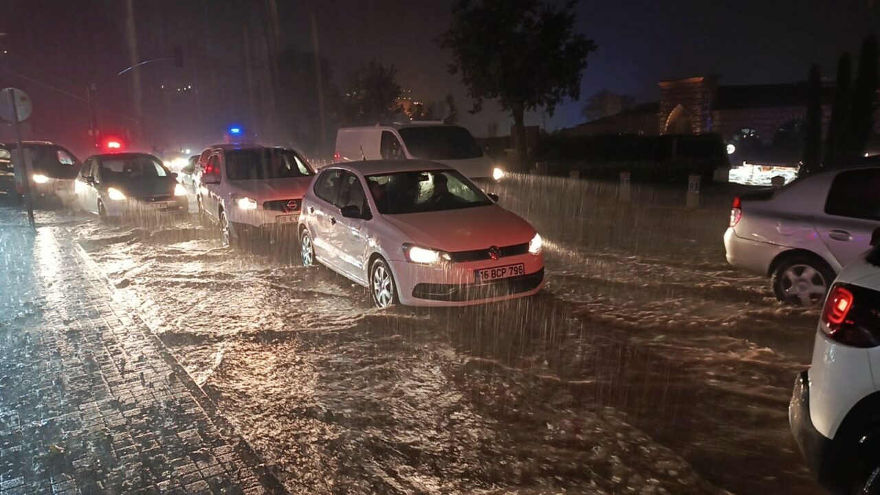 Metroloji Genel Müdürlüğü’nün uyarıları sonrası Bursa’da akşam saatlerinde sağanak ve dolu etkili oldu. Yaklaşık yarım saat süren yağmurda, Uludağ eteklerinden gelen sel suları kenti adeta göle çevirdi. Tafik durma noktasına gelirken, kentin en işlek caddelerinden Atatürk Caddesi ve Altıparmak Caddesi’nde sürücüler zor anlar yaşadı.