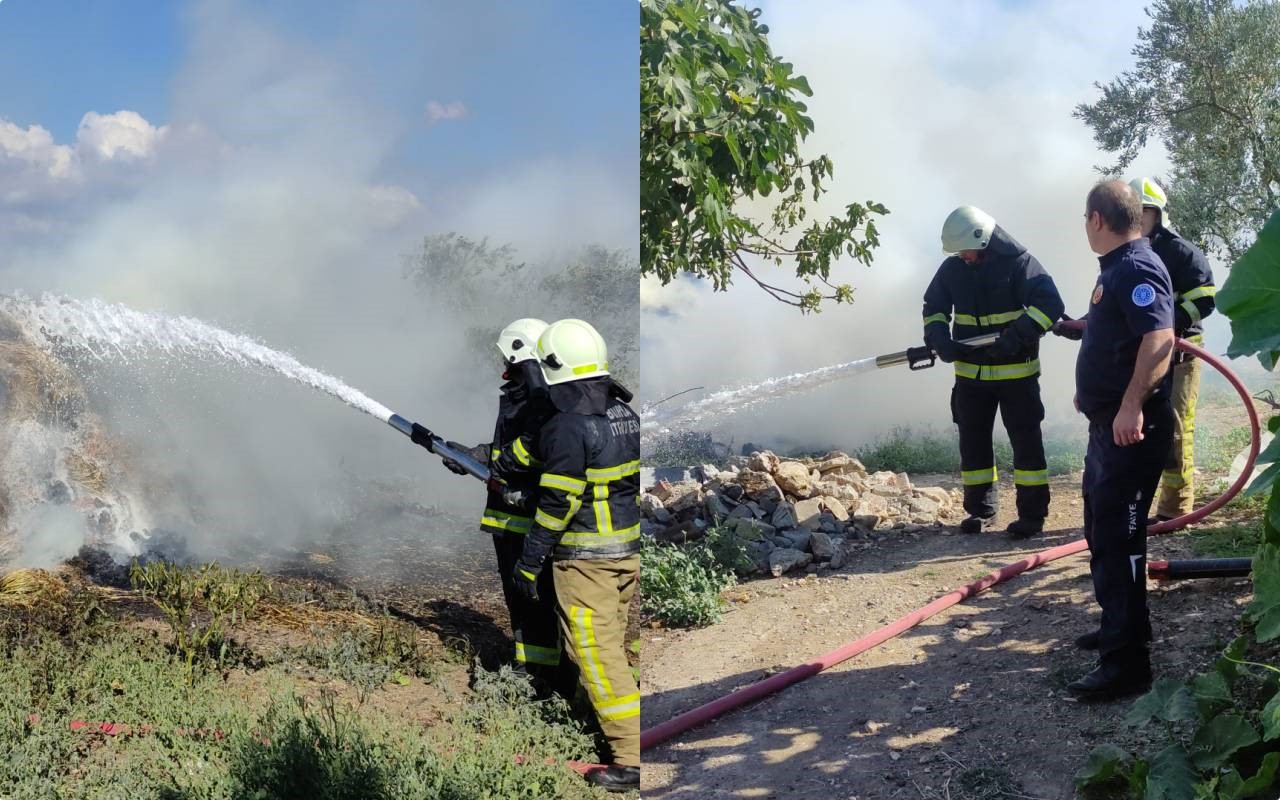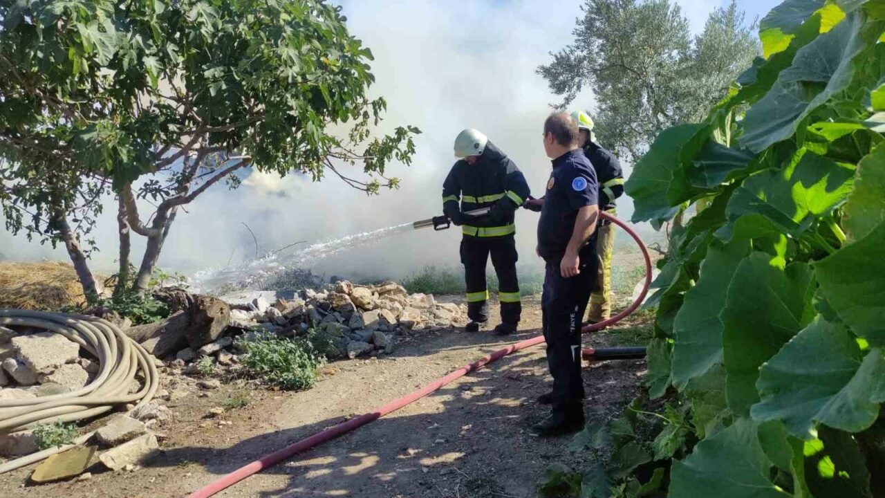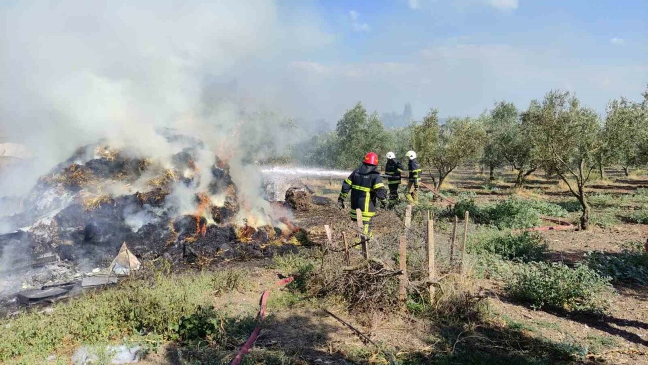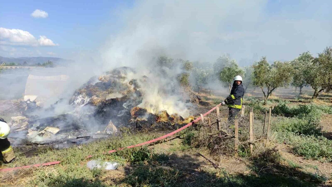 Bursa’nın Orhangazi ilçesinde çiftlik evinin bahçesindeki saman balyaları alevlere teslim oldu.