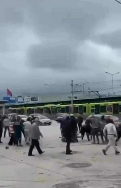 BURSA’DA ARALARINDA HUSUMET BULUNAN İKİ GRUP CADDE ÜZERİNDE KARŞI KARŞIYA GELİNCE KAVGAYA TUTUŞTU. SOPALARIN VE YUMRUKLARIN HAVADA UÇUŞTUĞU KAVGA ANI KAMERAYA YANSIRKEN, BAZILARI KENDİNİ KORUMAK İÇİN KASKLA KAVGAYA DAHİL OLDU.