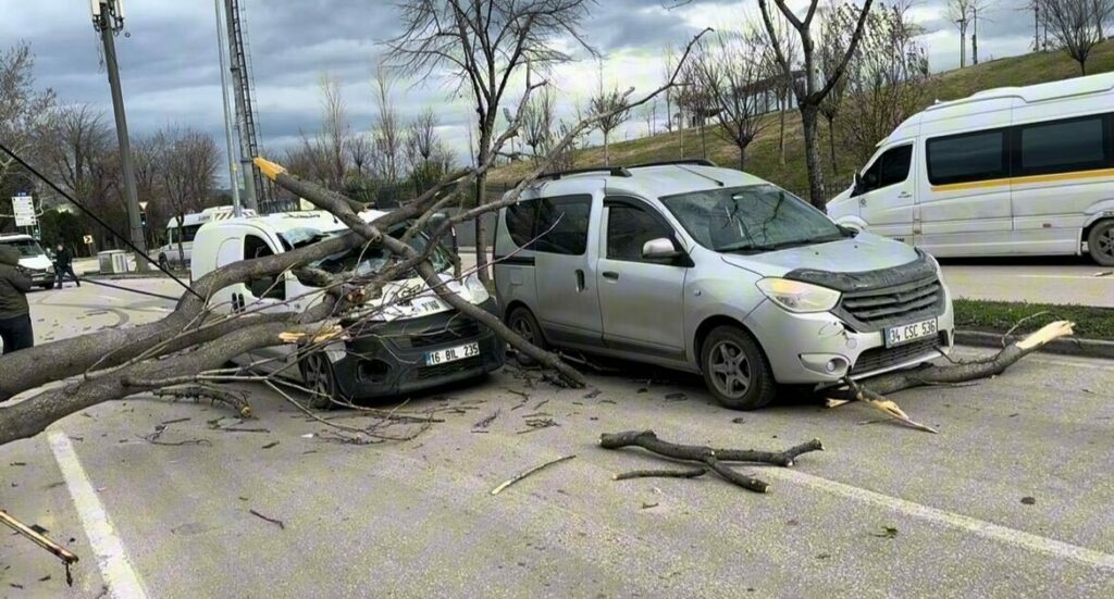Kent merkezinde hızı 75 kilometreye ulaşan rüzgar nedeniyle, Osmangazi ilçesi Zafer Mahallesinde cadde üzerine devrilen ağaçlar, seyir halindeki hafif ticari iki aracın üzerine düştü. Faciadan eşiğinden dönen sürücüler yaşadığı şok sonrası araçlarından inip 112 ekiplerinden yardım istedi. İhbar üzerine olay yerine sevk edilen itfaiye ekiplerince ağaçların altında kalan araçlar kurtarıldı.