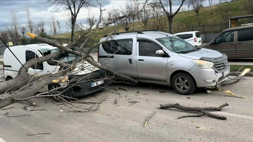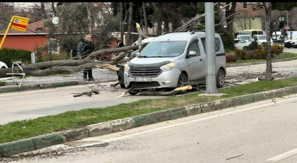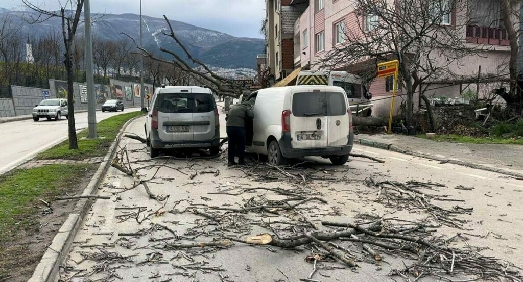 Kent merkezinde hızı 75 kilometreye ulaşan rüzgar nedeniyle, Osmangazi ilçesi Zafer Mahallesinde cadde üzerine devrilen ağaçlar, seyir halindeki hafif ticari iki aracın üzerine düştü. Faciadan eşiğinden dönen sürücüler yaşadığı şok sonrası araçlarından inip 112 ekiplerinden yardım istedi. İhbar üzerine olay yerine sevk edilen itfaiye ekiplerince ağaçların altında kalan araçlar kurtarıldı.