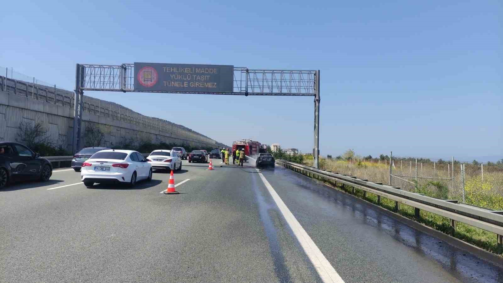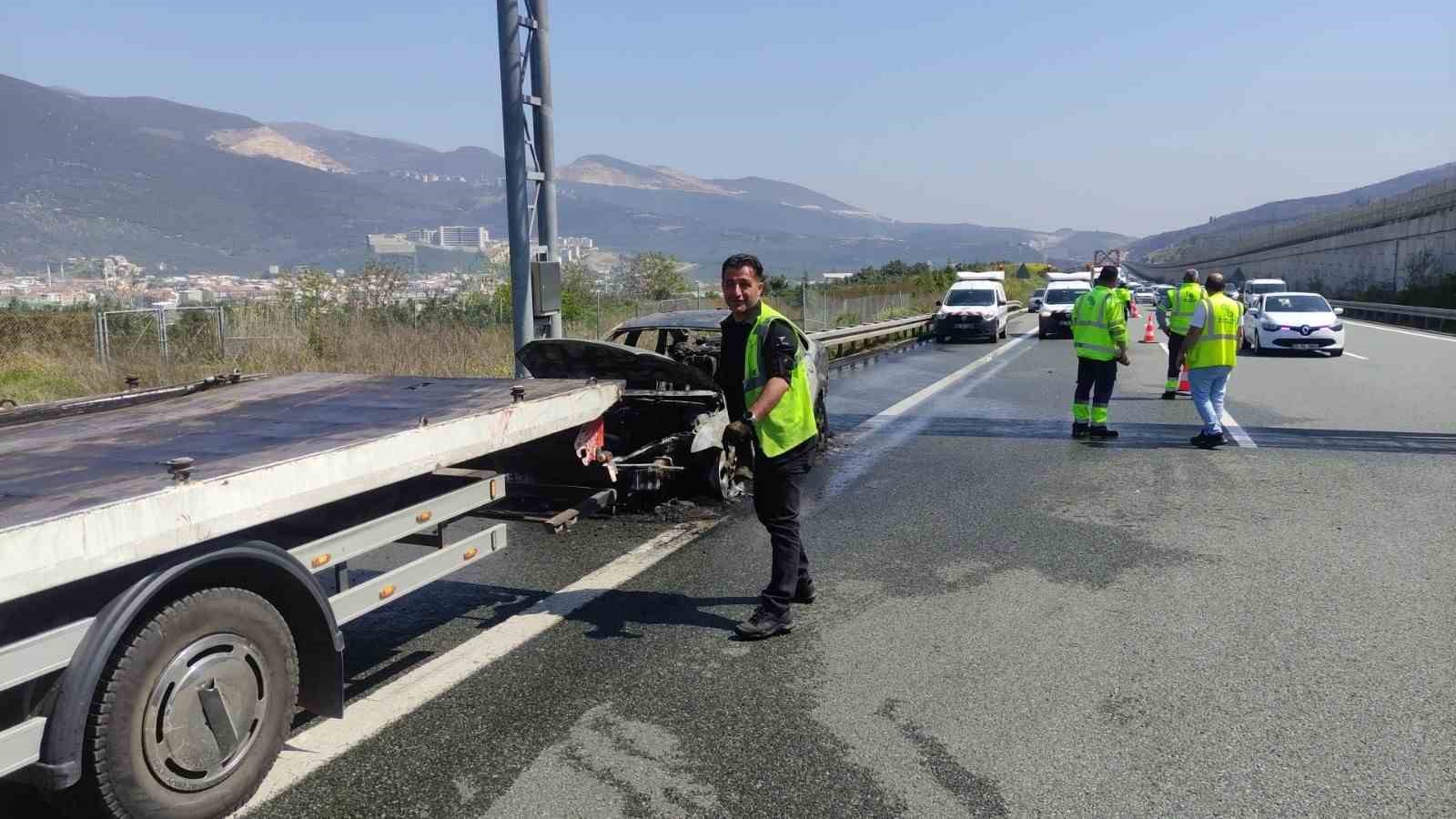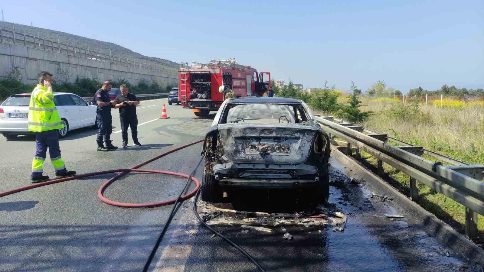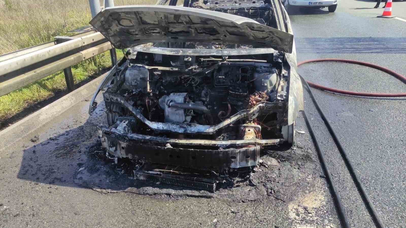 Gebze-Orhangazi-İzmir Otoyolu’nda seyir halinde olan bir otomobil, motor bölümünden önce dumanlar çıktı ardından alev aldı. İçinde 3 kişinin bulunduğu otomobilin sürücüsünün son anda emniyet şeridine çekip aracı terk etmeleri ile alev topuna dönen otomobil küle döndü.