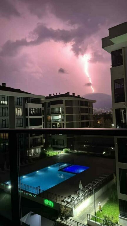 Bursa’da akşam saatlerinde atıştıran yağmur damlaları gecenin karanlığı ile birlikte yerini gök gürültüsüne bıraktı. Gökyüzünden neredeyse yere kadar uzanan şimşek gecenin karanlığını aydınlığa çevirdi.
