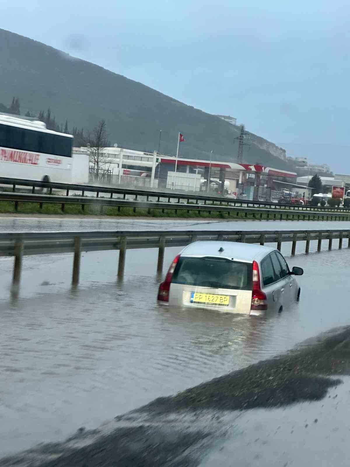 Bursa’da sağanak nedeniyle göle dönen Gemlik-Orhangazi kara yolunda mahsur kalan araç çekiciyle kurtarıldı.